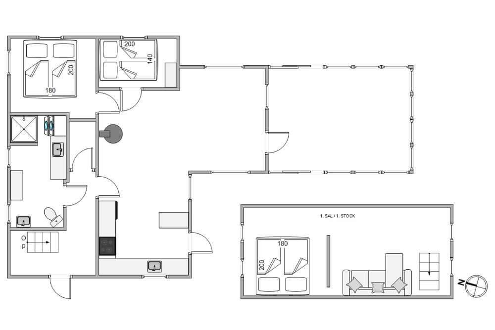 Holmsborgvej 35 har rigtig god plads til sine 6 gæster. I stueetagen er der 2 soverum og på 1. sal har I et ekstra soverum i form af en åben hems i forlængelse med en ekstra hyggestue, det giver mulighed for lidt ekstra privatliv.