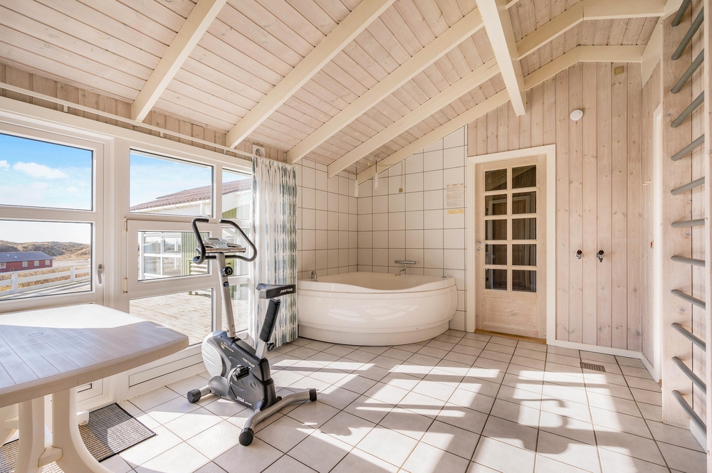 En af sommerhusets helt store bonusser er det skønne kombinerede wellness- og træningsrum. I kan med andre ord både få pulsen op og ned i sommerhuset. I rummet finder I blandt andet motionscykel og træningsribbe, så I kan holde jeres aktive under jeres ophold. I kan jo passende afslutte et træningspas med en tur i det dejlige spabad eller forkæle jer selv med en stille stund i den lune sauna.