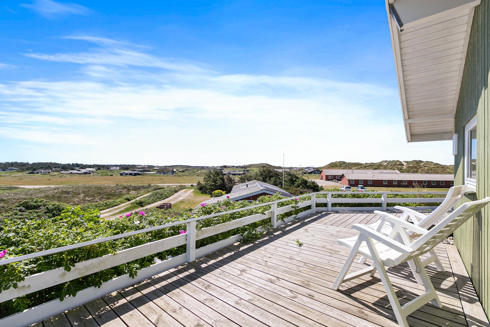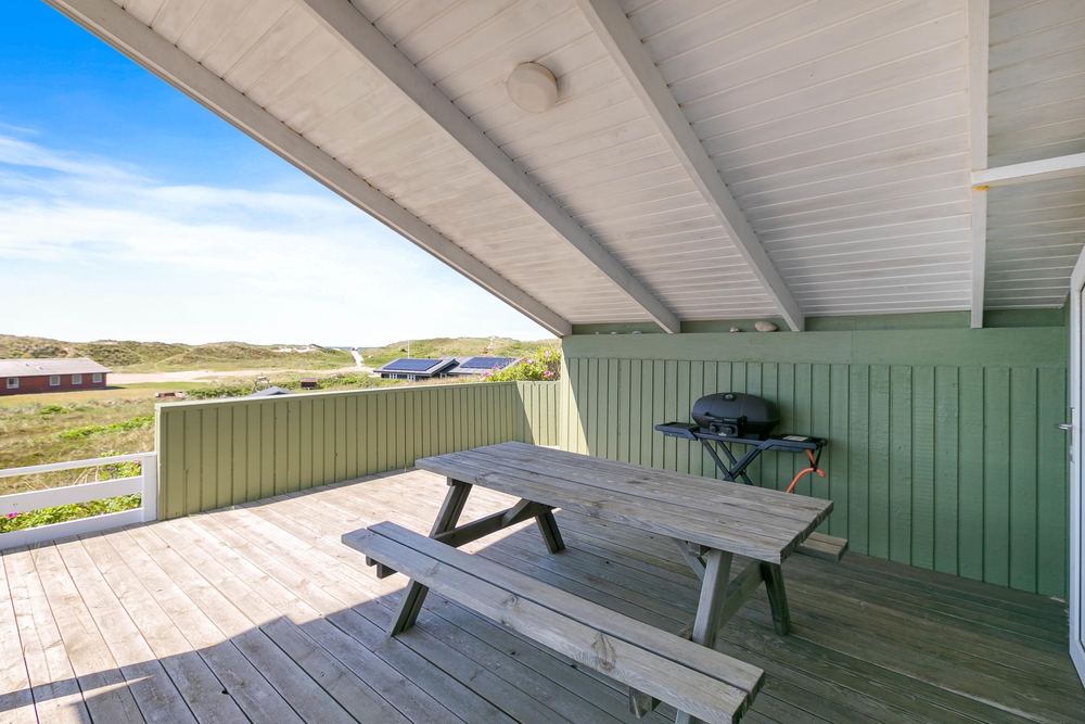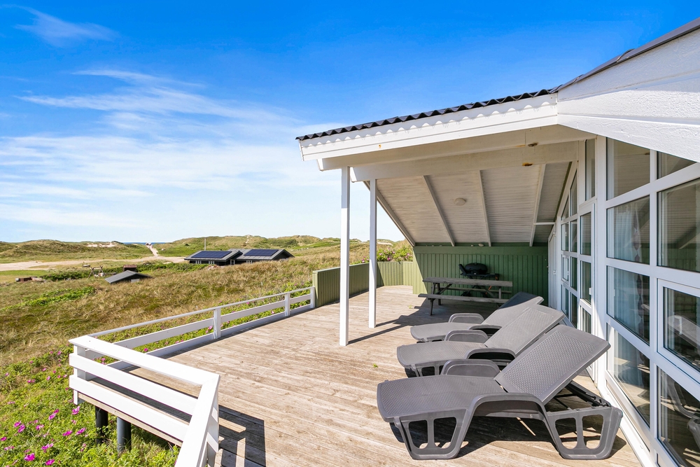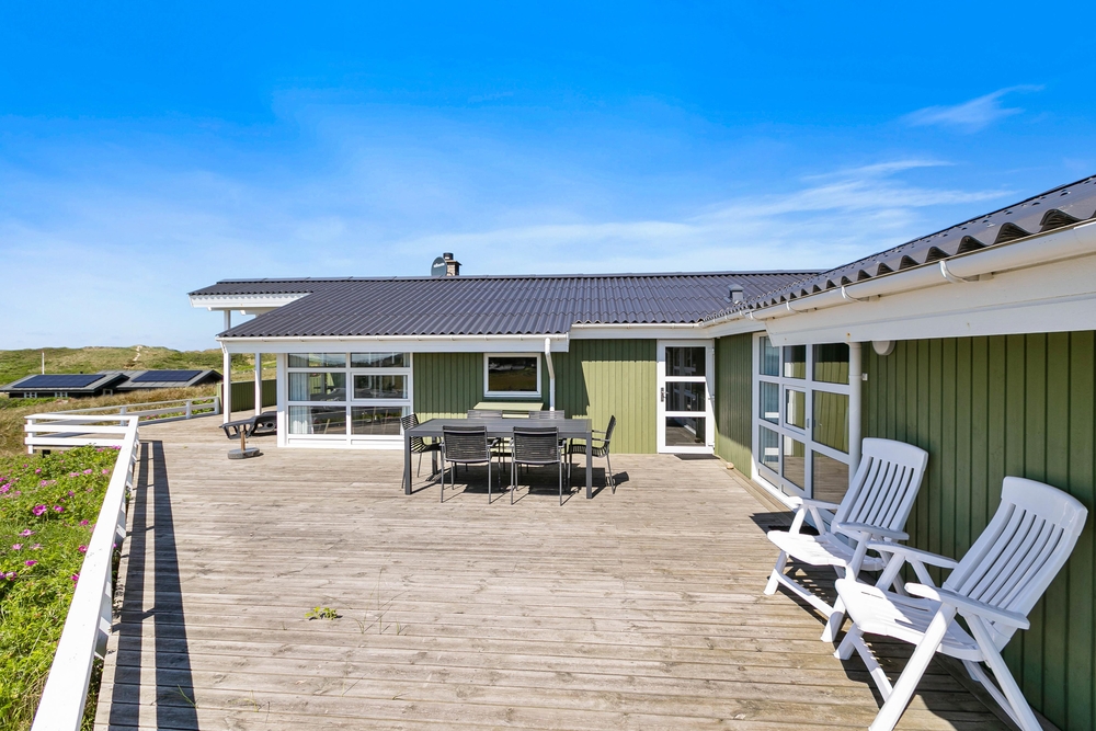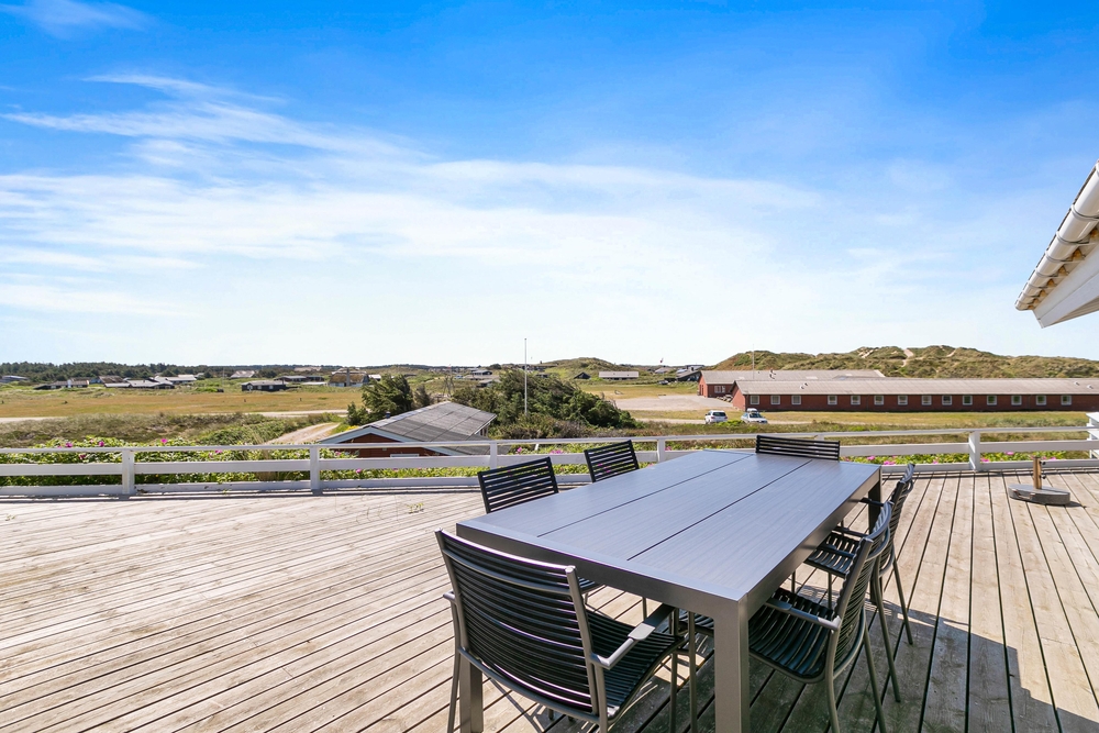 Fra stuen træder I direkte ud på den skønne syd-, øst-, og vestvendte terrasse med områdets måske nok flotteste udsigt. Terrassen er ideel som morgenterrasse, hvor I har solen i øst. I løbet af dagen kan I nyde solen henslængt i en liggestol, mens I om aftenen kan tænde op i grillen og stege et par saftige bøffer, alt imens I betragter den røde solnedgang bag klitterne og lytter til Vesterhavets brusende bølger i baggrunden.