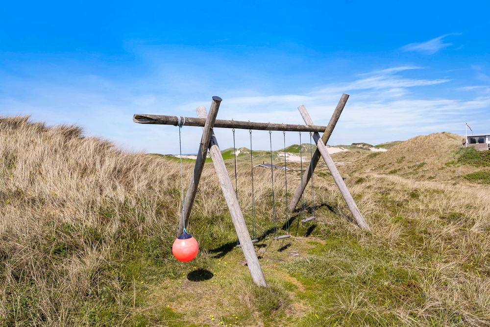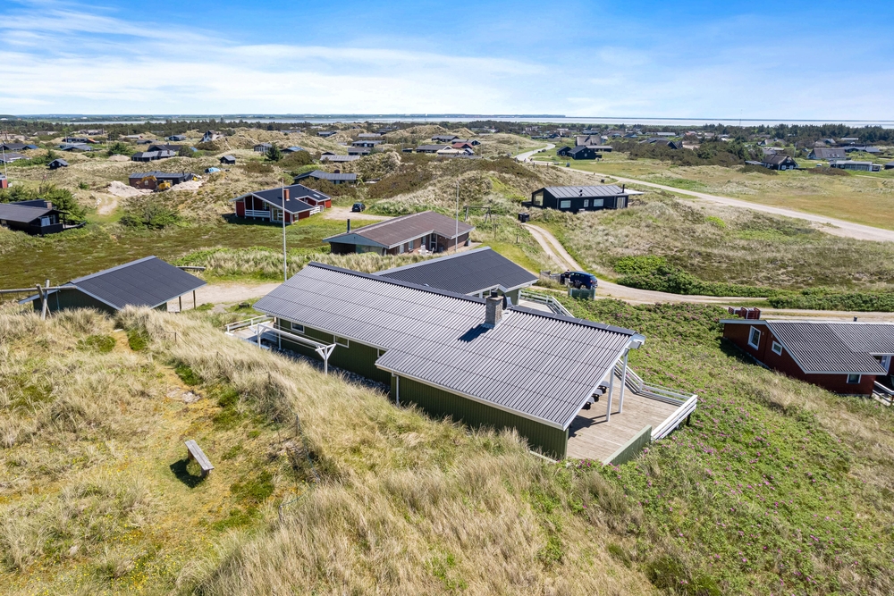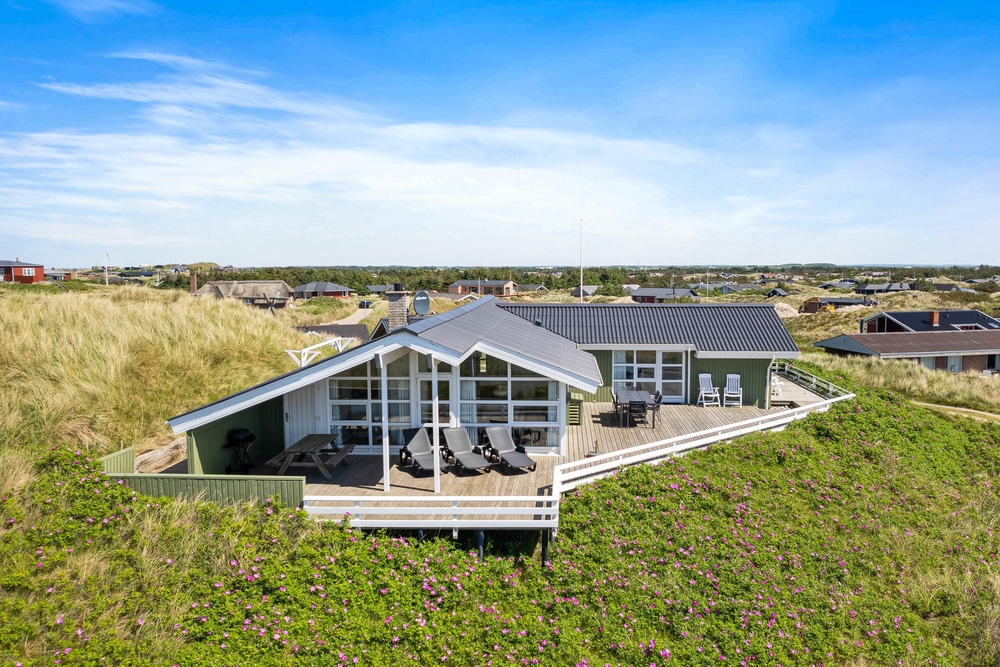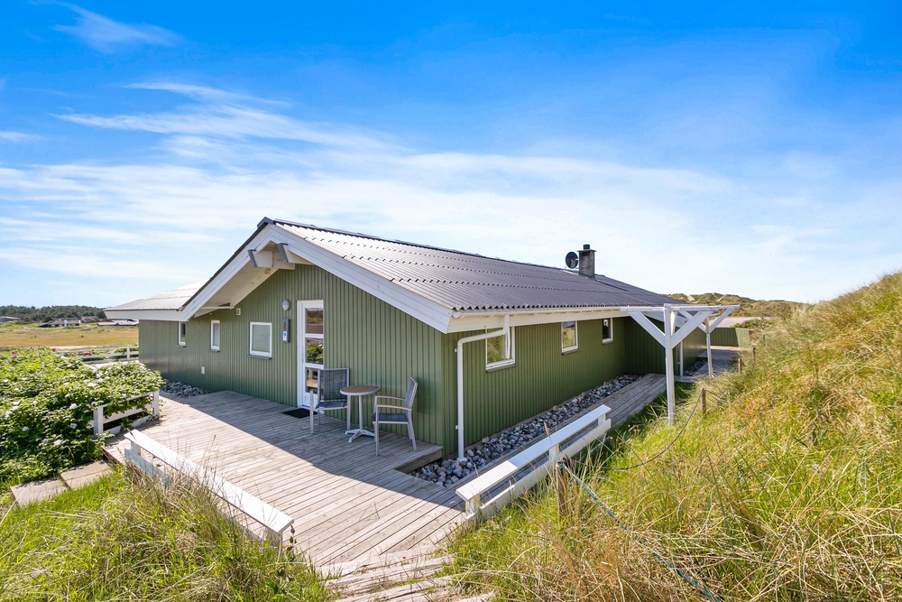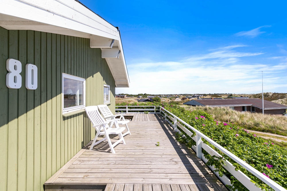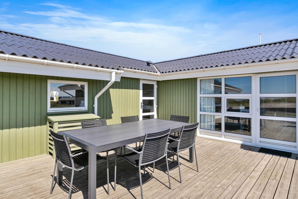 Fra stuen træder I direkte ud på den skønne syd-, øst-, og vestvendte terrasse med områdets måske nok flotteste udsigt. Terrassen er ideel som morgenterrasse, hvor I har solen i øst. I løbet af dagen kan I nyde solen henslængt i en liggestol, mens I om aftenen kan tænde op i grillen og stege et par saftige bøffer, alt imens I betragter den røde solnedgang bag klitterne og lytter til Vesterhavets brusende bølger i baggrunden.