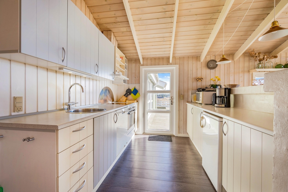 I det pæne og lyse køkken finder I alt det, I får brug for på jeres ferie. Det er fint udstyret med blandt andet opvaskemaskine, mikroovn og køleskab med fryser. Der er god plads i køkkenet, og mens I er i færd med at udfolde jer kulinarisk, kan I lade blikket vandre ud mod den flotte udsigt.