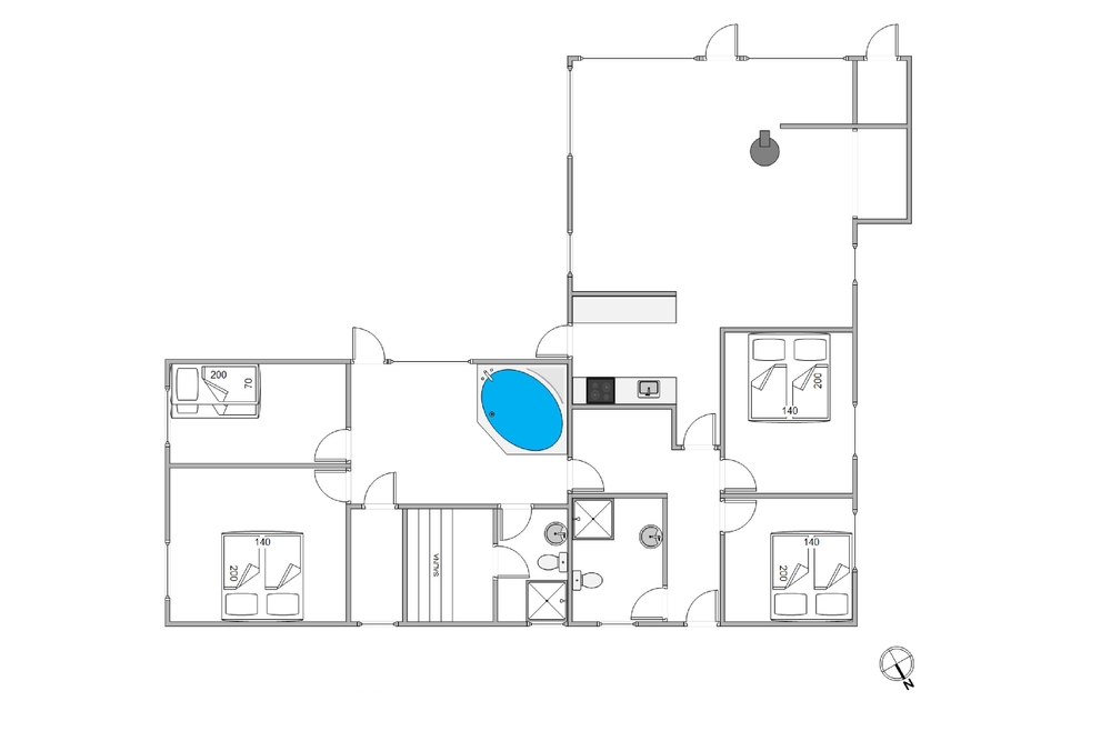Huset er indrettet med 4 lyse og gode soveværelser. 3 af disse værelser er udstyret med komfortable dobbeltsenge, mens det sidste værelse er indrettet med 1 køjeseng og et mindre skrivebord. I har derfor god plads til at kunne invitere bedsteforældrene med på ferie.