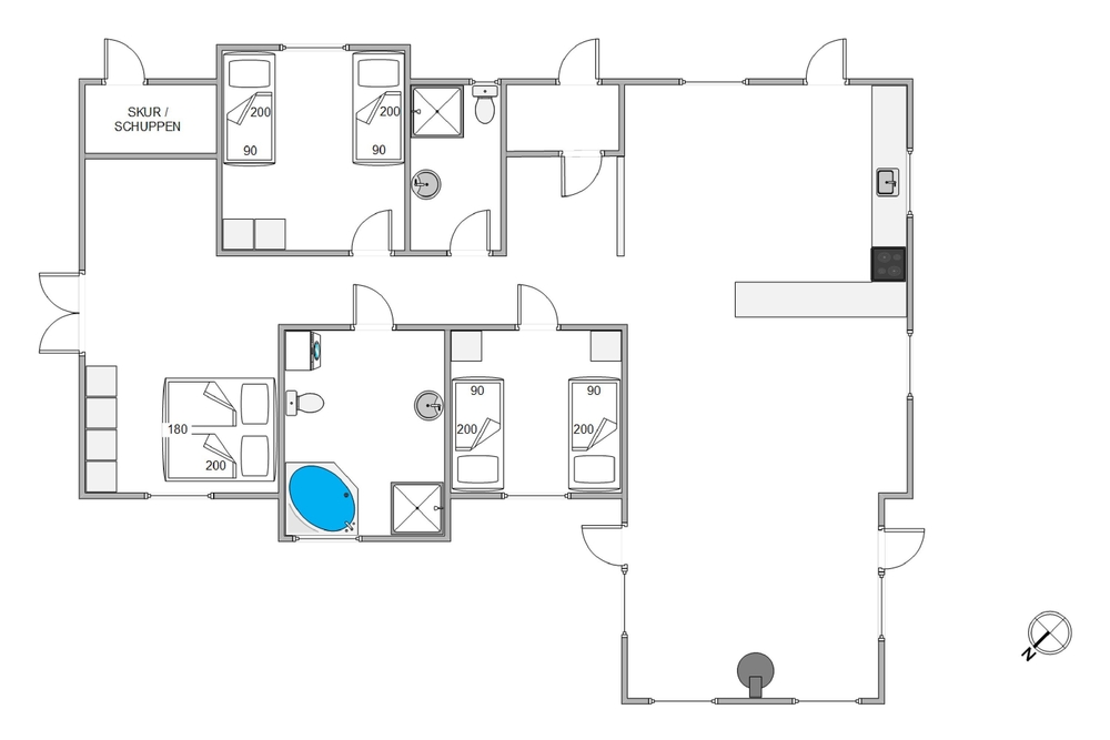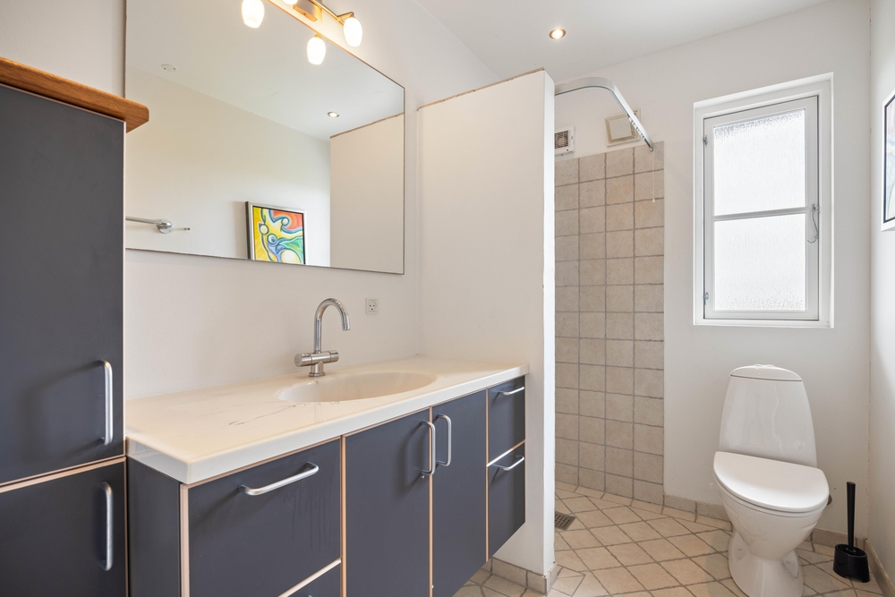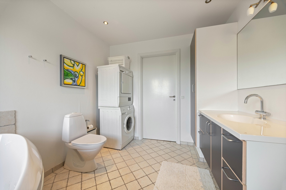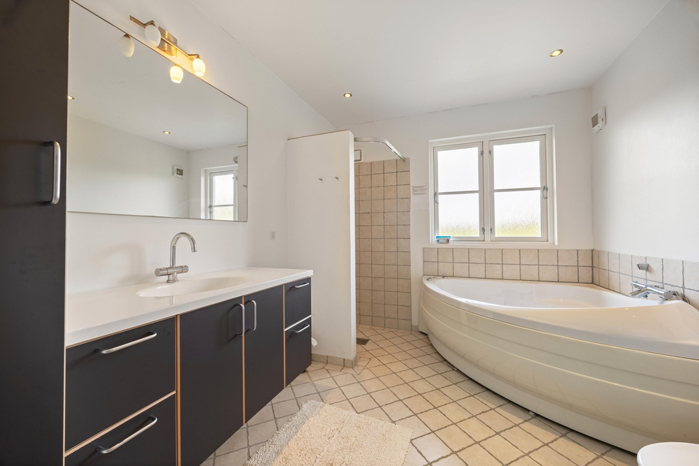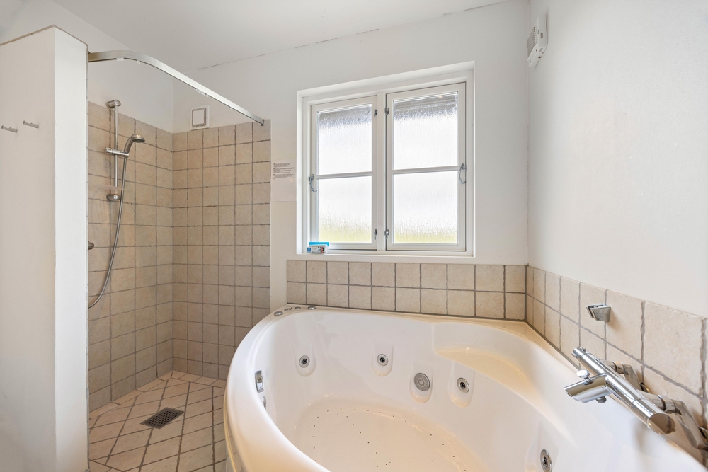 Feriehuset har to badeværelser, hvor gulvvarme i det ene badeværelse sikrer ekstra komfort. På det ene badeværelse finder I også en tømmespa, hvor I kan komme helt ned i gear efter en dag fyldt med oplevelser.