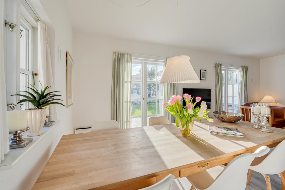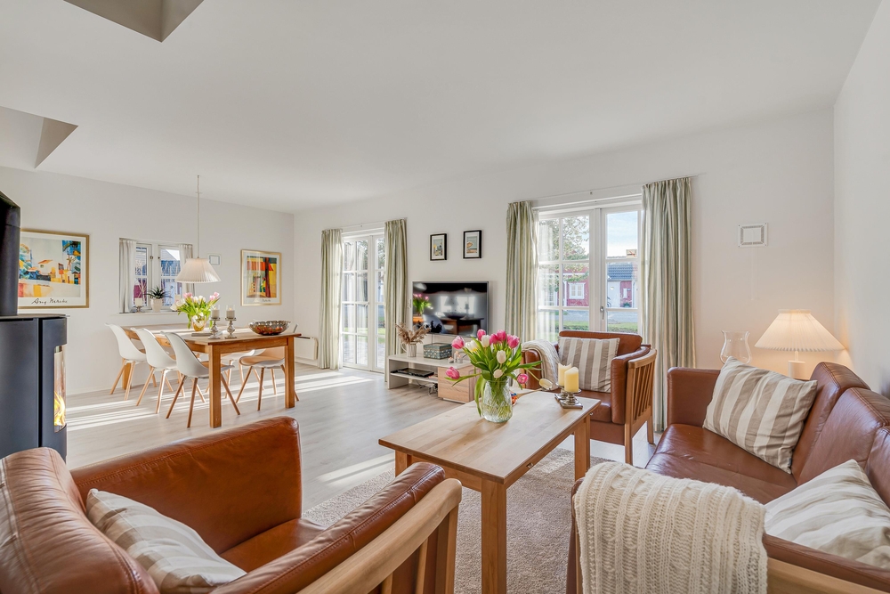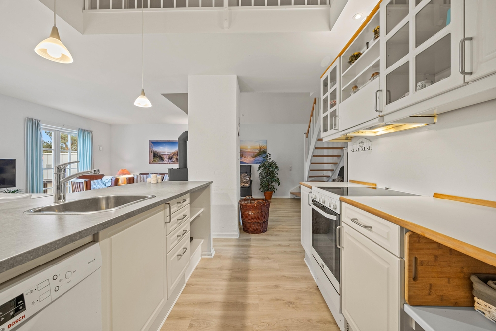 I det kombinerede køkken- og opholdsrum er der god plads til at slappe af i sofahjørnet med en god bog eller en spændende film i fjernsynet og med brændeovnens knitrende flammer i baggrunden bliver ferien kun ekstra god. Køkkenet har i 2025 gennemgået en lettere renovering med bl.a. en anden bordplade.