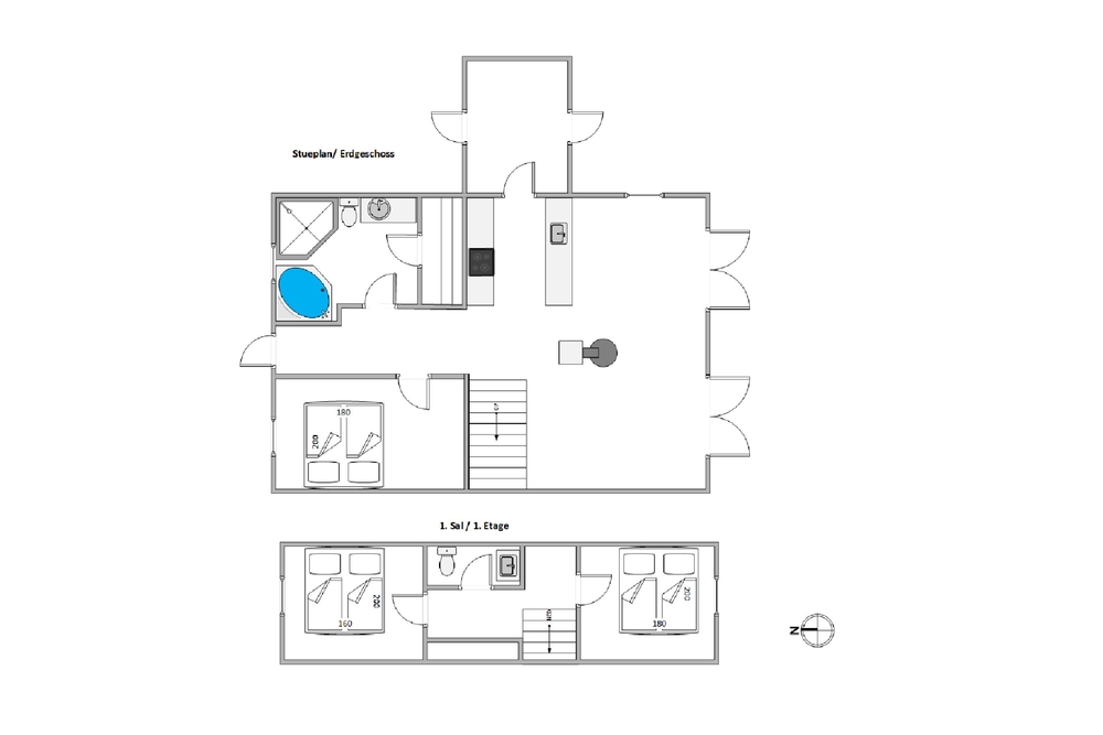 Det store badeværelse har gulvvarme og indeholder en sauna og spa ? her kan I efter en lang dag i den friske havluft læne jer tilbage i varmen på en kølig vinterdag ? og på 1. sal er også et gæstetoilet til rådighed. Her finder I også en alkove med madrasser, som børnene vil elske at hygge sig på.