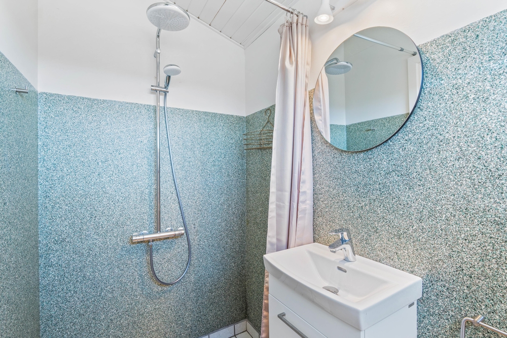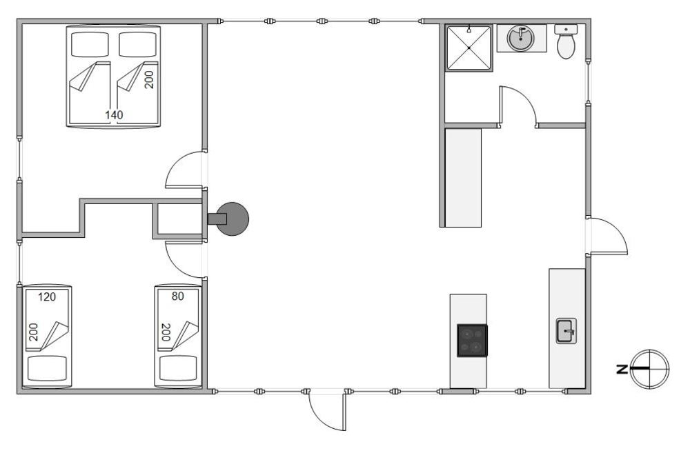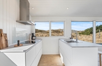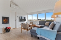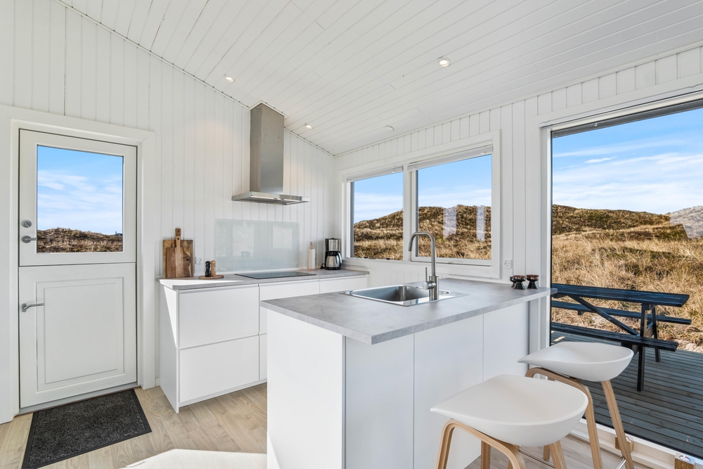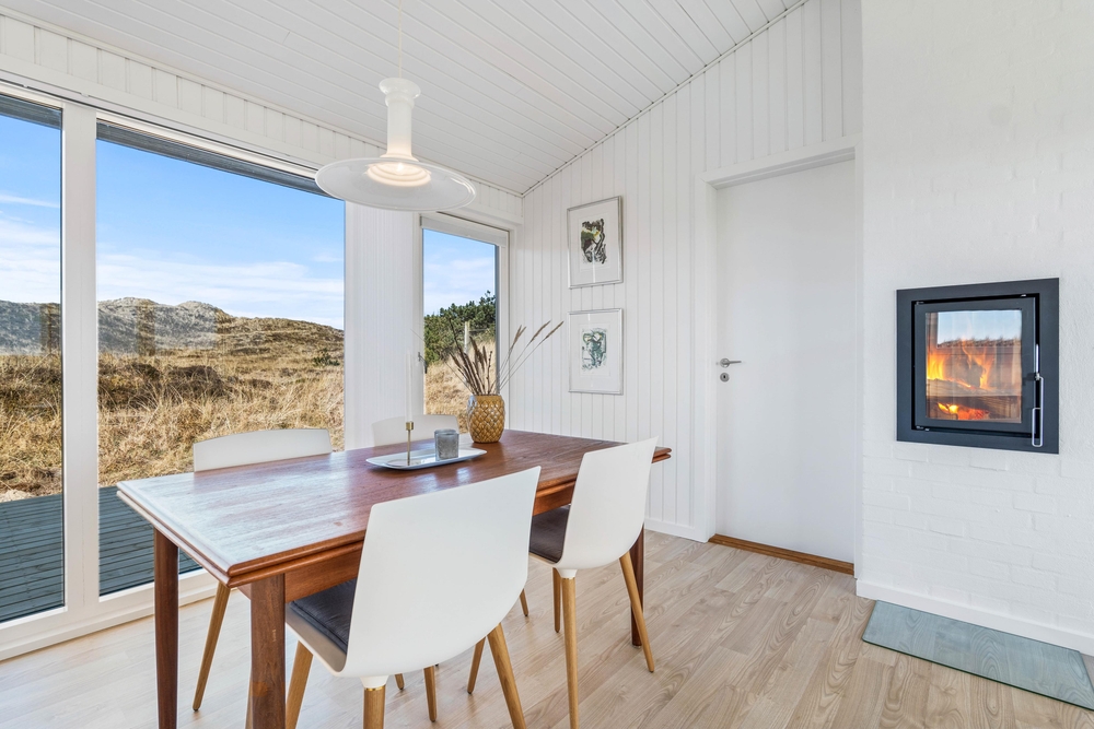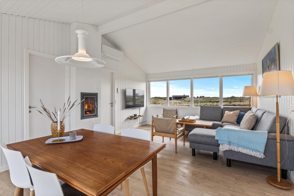 Dette sommerhus er praktisk indrettet. Hjertet i ferieboligen er stuen med den åbne forbindelse til køkkenet. Opvaskemaskinen og induktionsovnen gør madlavningen til en leg, og efterfølgende kan I afslutte aftenen med spil eller film, mens brændeovnen omfavner jer med varmen og spreder hyggen.