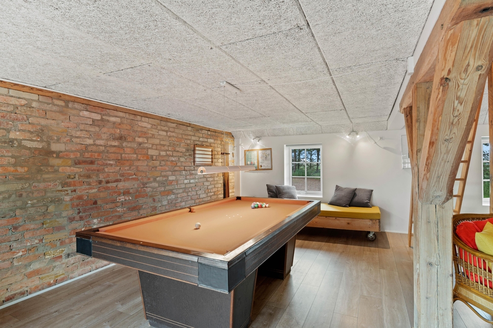 Et stort aktivitetsrum med billard, TV og hyggehjørne sørger for underholdningen for alle ? børn som voksne ? også på regnvejrsdage. I aktivitetsrummet er der delvis åbent helt op i kip, hvilket giver et dejligt stort rum. Her er også husets hems med 2 sovepladser. Et perfekt rum for hele familien ? eller til familiens unge.