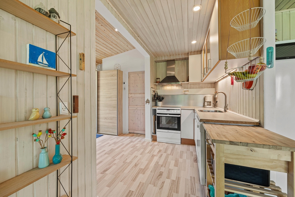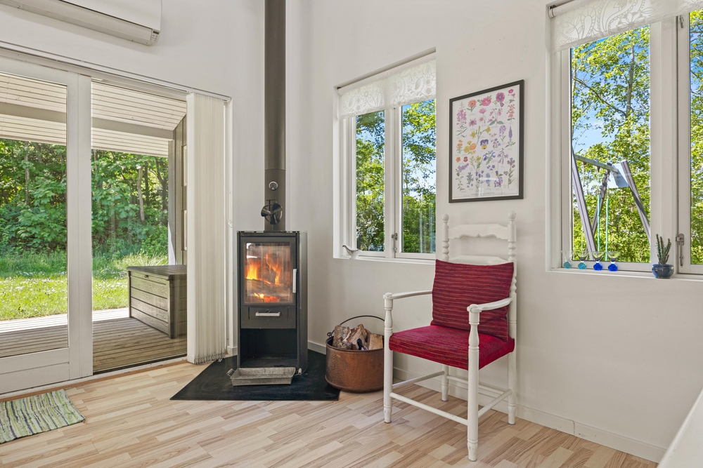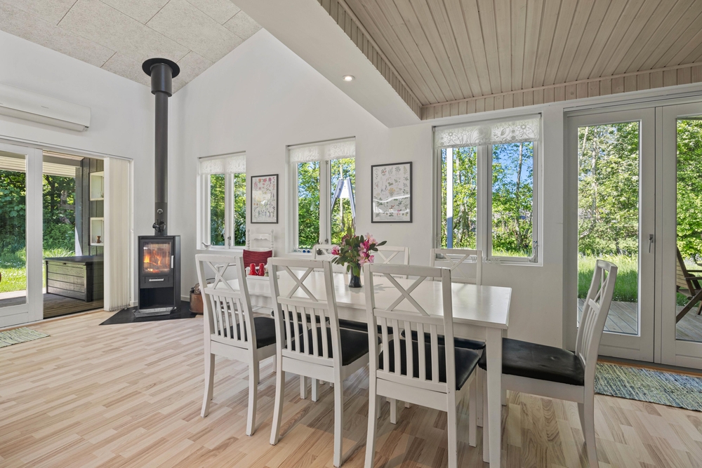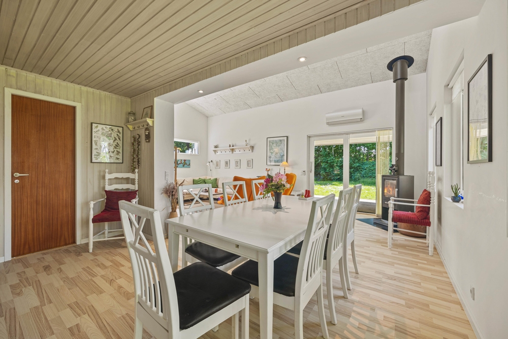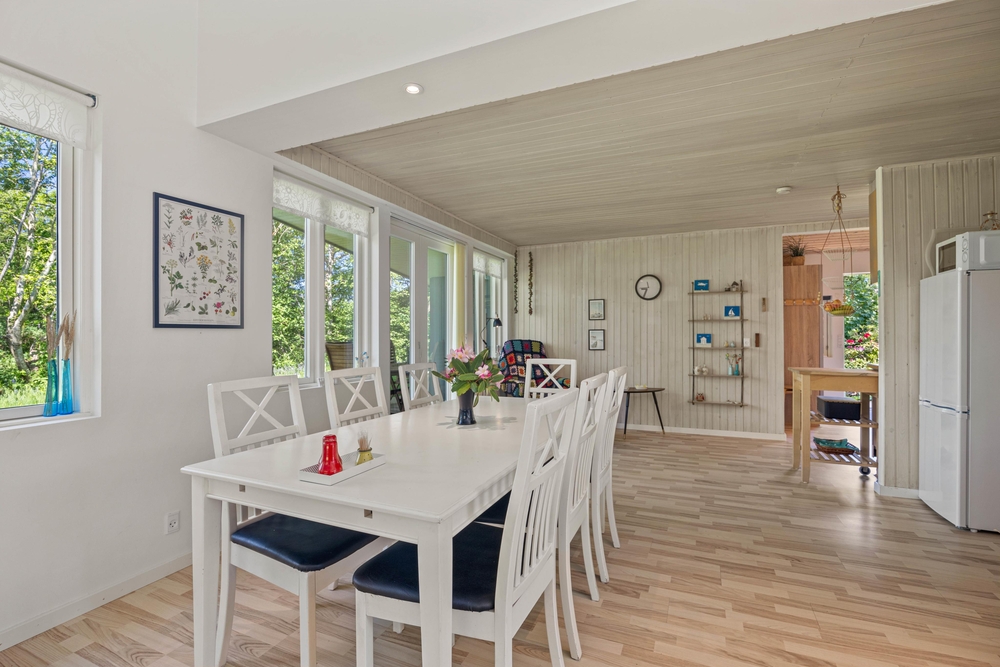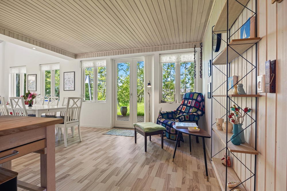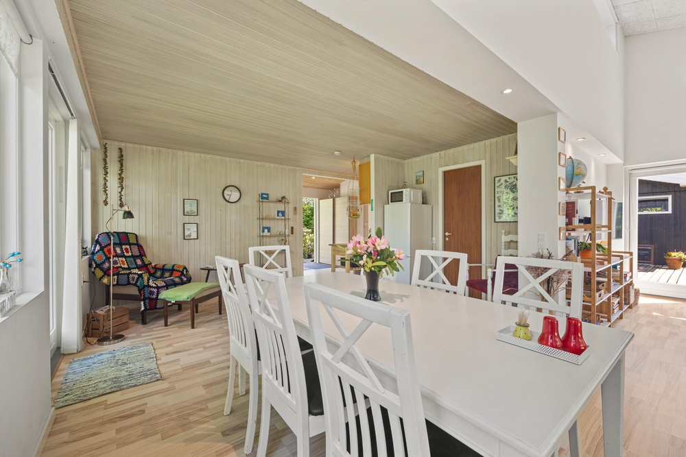 Dette lyse og charmerende sommerhus byder velkommen til hyggelige stunder. Med rigelige vinduer strømmer naturligt lys ind i rummene, hvilket skaber en behagelig atmosfære.