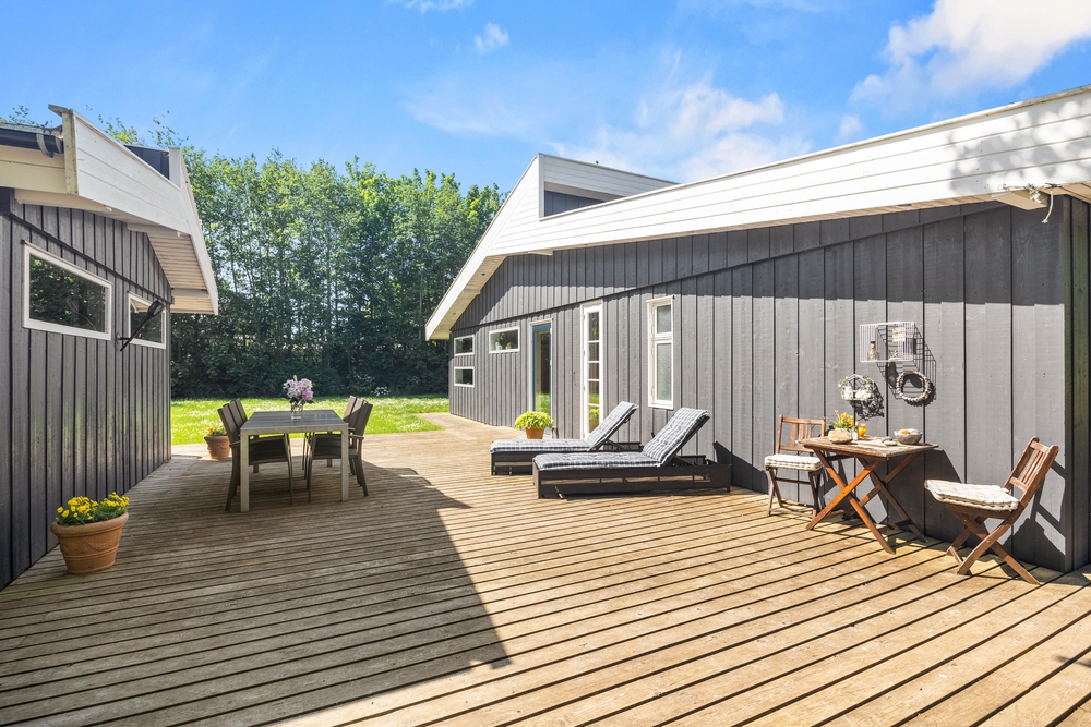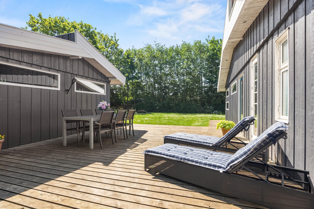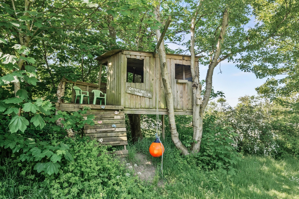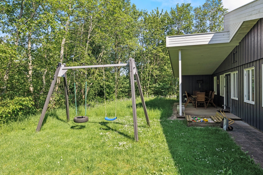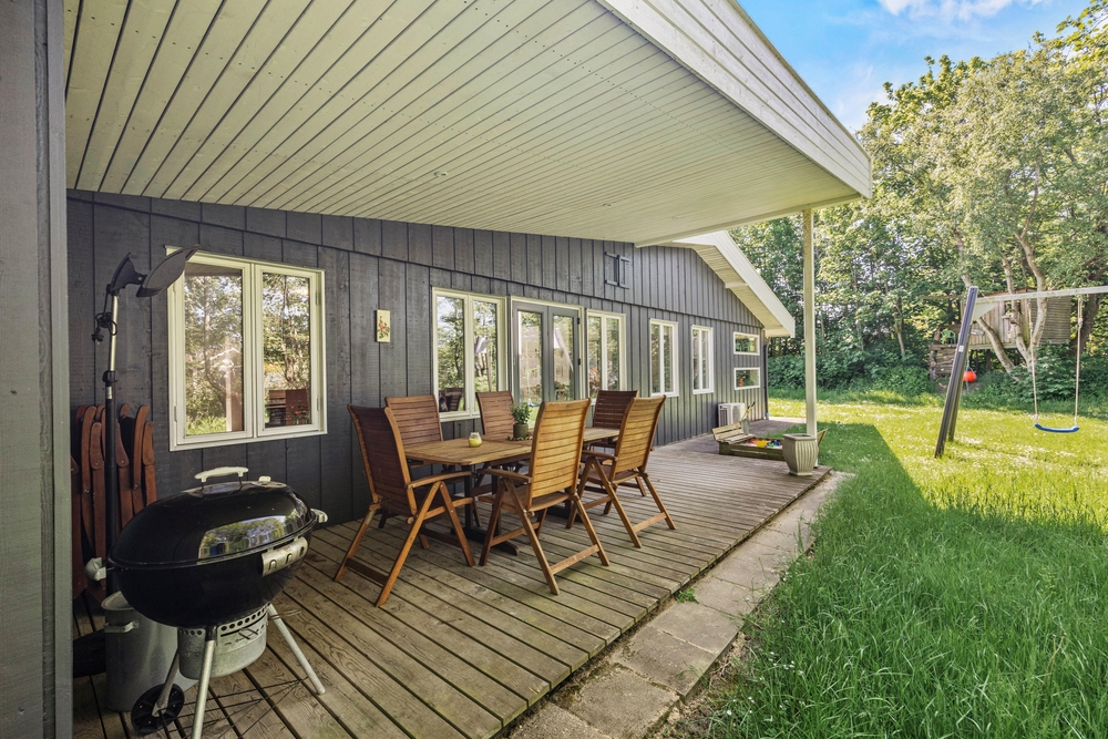 Nogle af terrasserne er overdækkede og delvist afskærmede, perfekte til afslapning i skyggen, mens andre er åbne og inviterer til solbadning. Her kan I samles til dejlige madaftener under åben himmel, da der findes både grill og havemøbler til rådighed. Og for dem, der ønsker at nyde solen, er der også solvogne til rådighed. Derudover er der et legehus, en gynge og en sandkasse til børnene, så de kan lege og udforske i timevis.