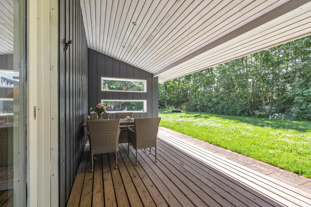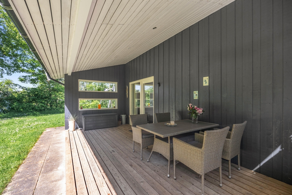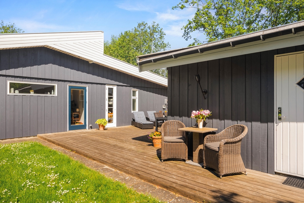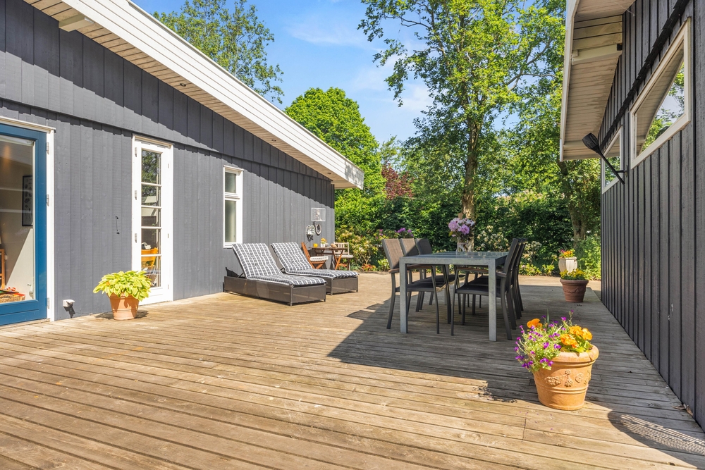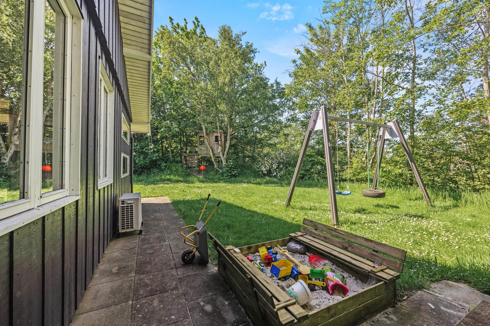 På den 1160 kvadratmeter store plænegrund er der masser af plads til leg og sjov ? måske endda en kongespilsturnering? Omkring huset venter flere hyggelige siddepladser på flere terrasser, nogle tilgængelige fra stuen, andre fra spisestuen og endda fra forskellige udgange fra huset. På disse terrasser er der altid en solplet at finde, hvor I kan nyde morgenkaffen i ro og mag.