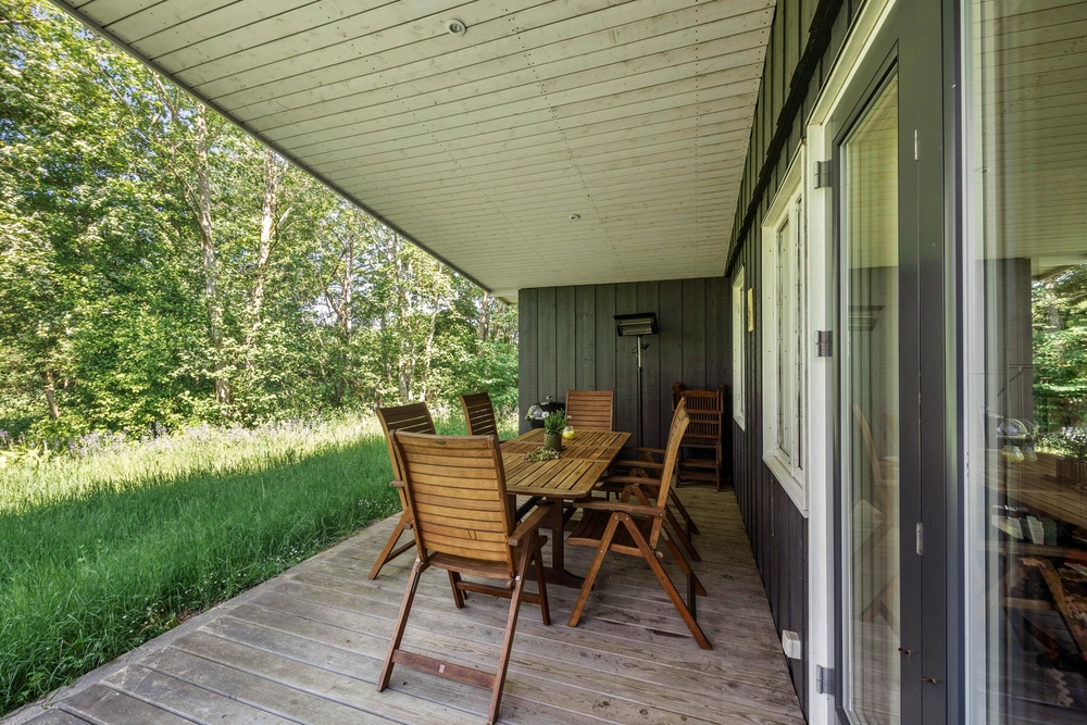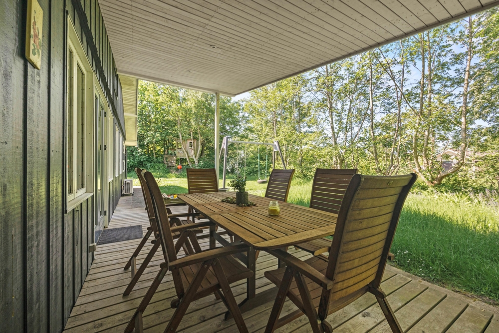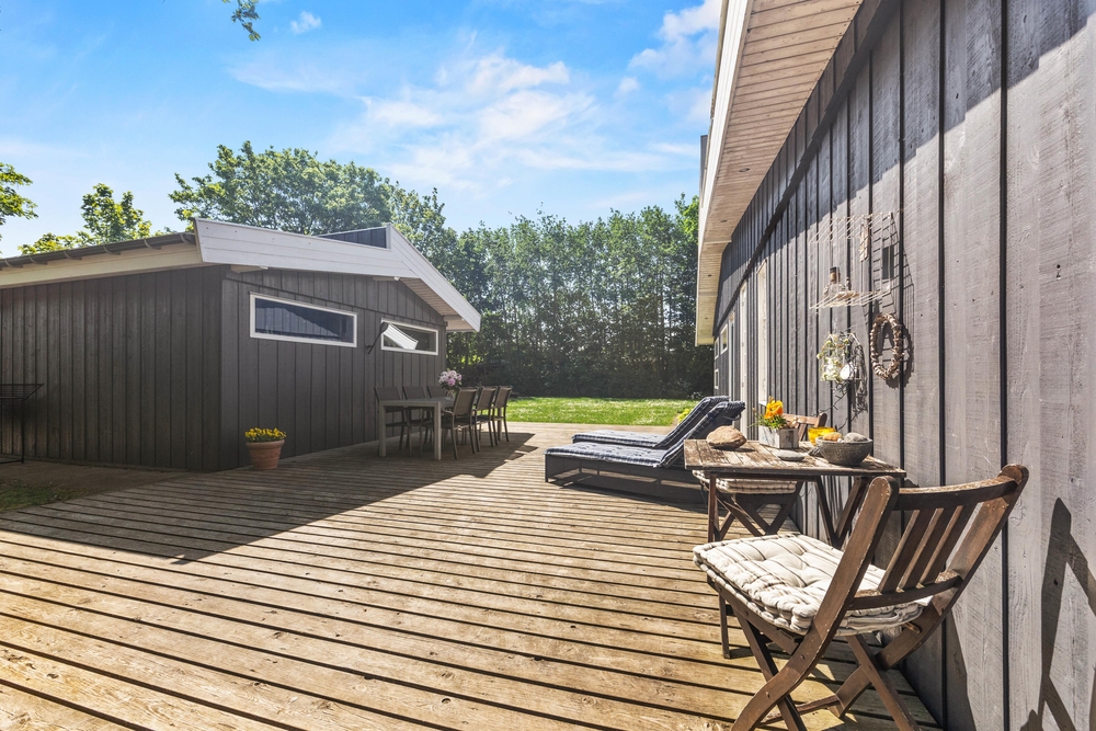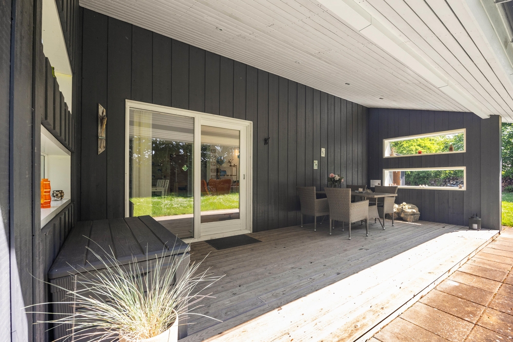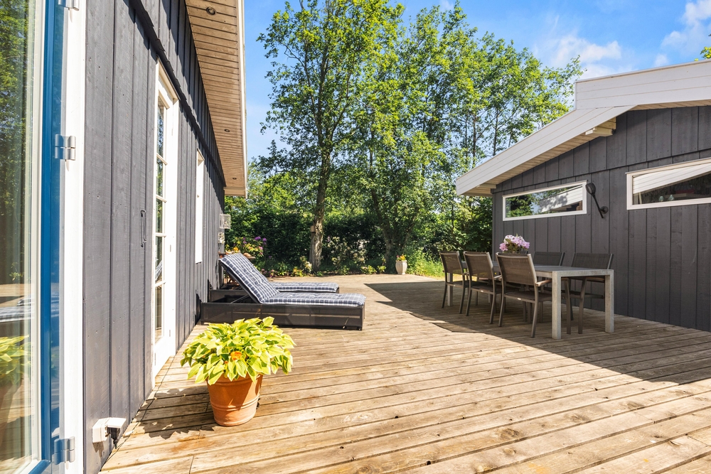 På den 1160 kvadratmeter store plænegrund er der masser af plads til leg og sjov ? måske endda en kongespilsturnering? Omkring huset venter flere hyggelige siddepladser på flere terrasser, nogle tilgængelige fra stuen, andre fra spisestuen og endda fra forskellige udgange fra huset. På disse terrasser er der altid en solplet at finde, hvor I kan nyde morgenkaffen i ro og mag.
