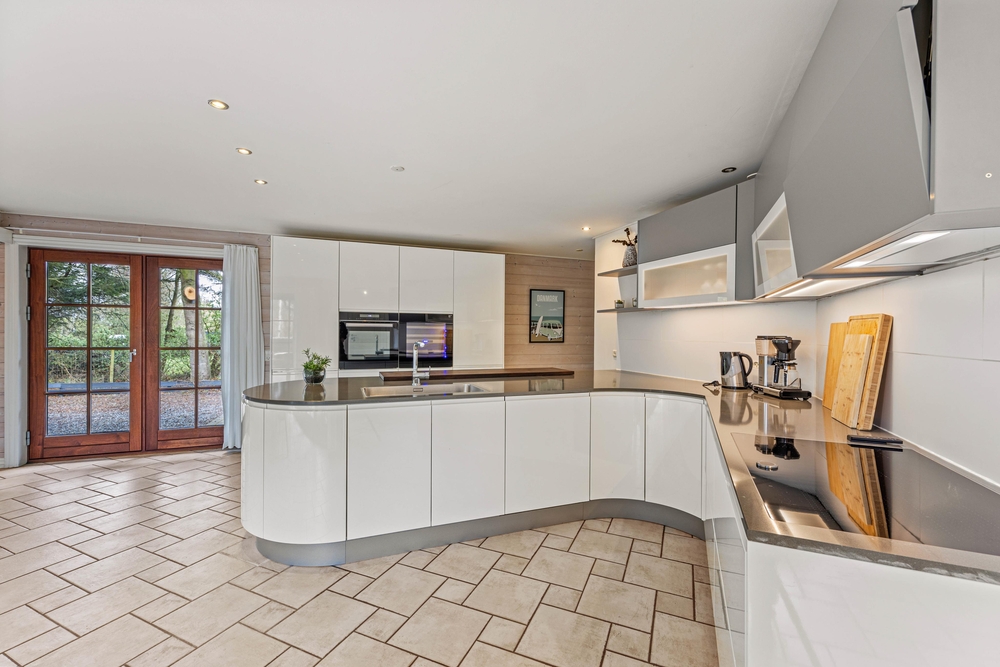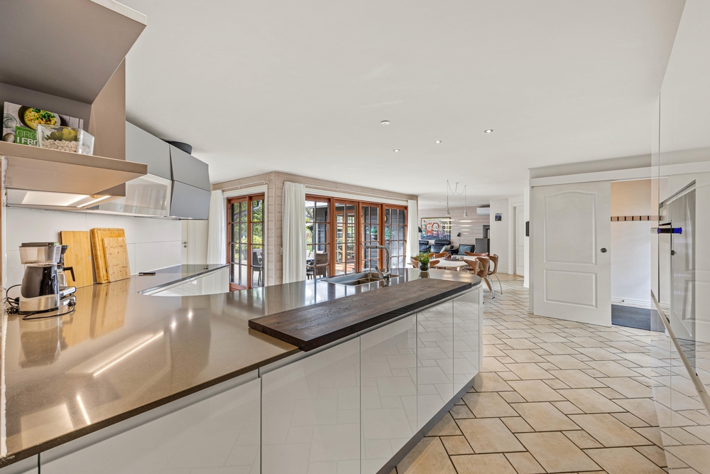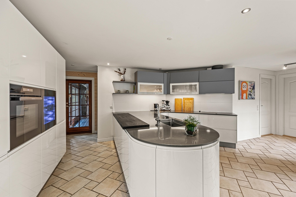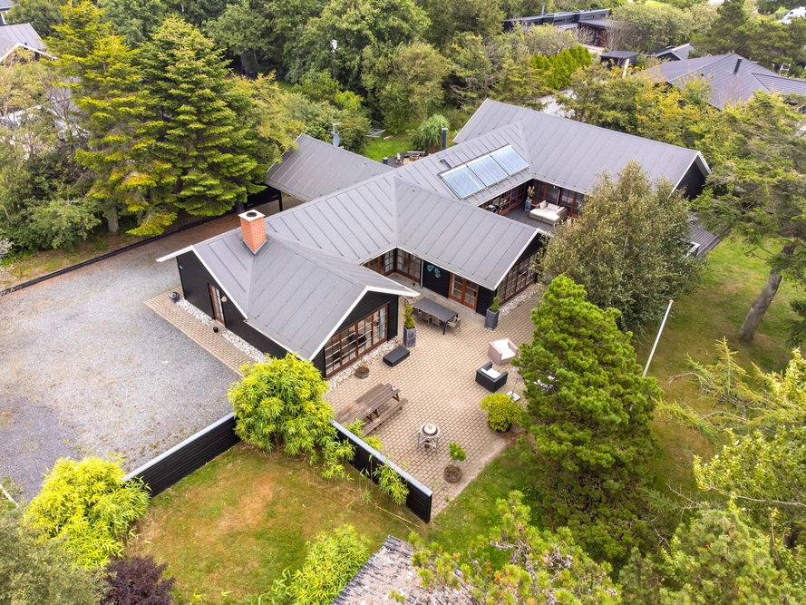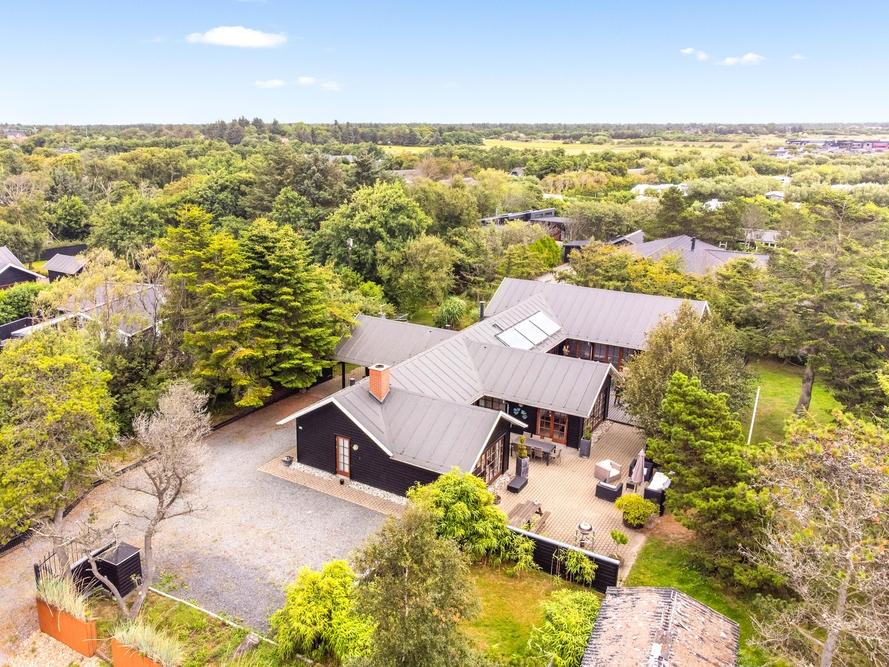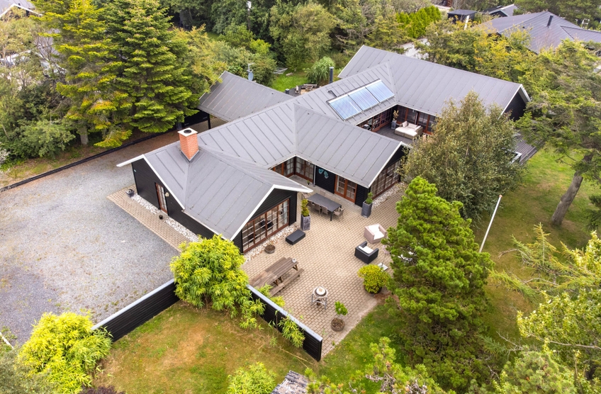 Indendørs byder det 230 kvadratmeter store sommerhus på en lys indretning, der bliver komplimenteret på bedste vis af det skønne lysindfald. Det store indendørs samlingspunkt er alrummet, hvor køkkenet ligger i åben forbindelse med spisestue og stue, og hvor I kan nyde hinandens selskab med lyden af brændeovnens knitren i baggrunden.