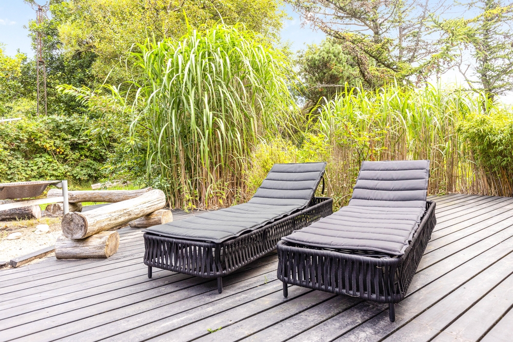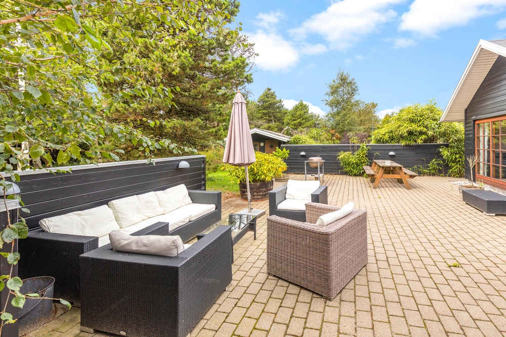 Sommerhusets udeområde er det perfekte sted at tilbringe feriens solrige dage. På udeområdet venter jer blandt andet en stor terrasse, hvor I kan finde jer til rette i havemøblerne og liggestolene. Her vil I helt sikkert kunne finde en god plads i solen.