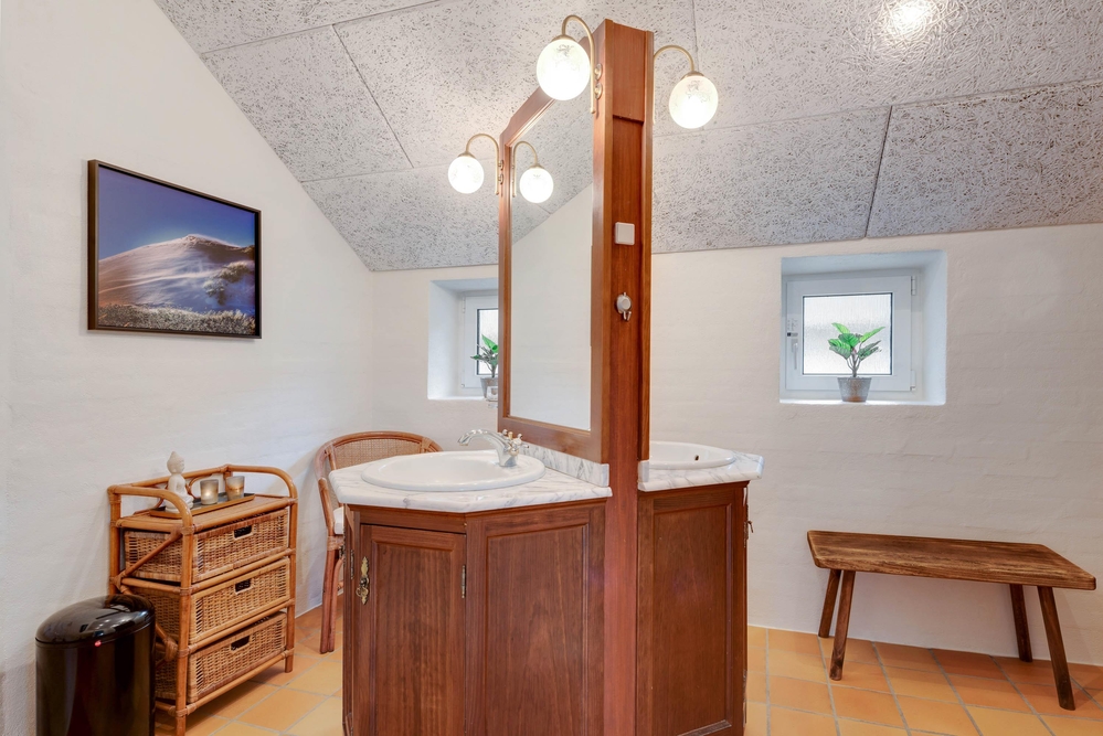 Fra et af hovedhusets badeværelser er der indgang til en lækker sauna, hvor I kan slappe af og få varmen igen efter en forfriskende dag ved Vesterhavet.