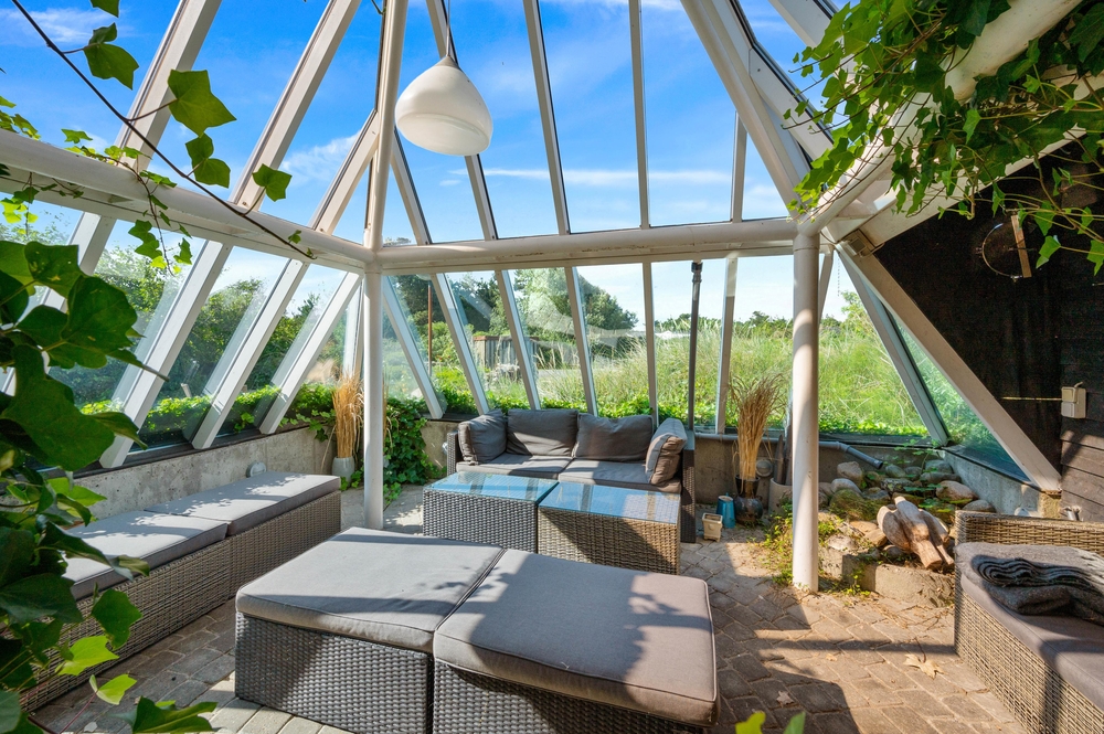 I haven står en arkitektonisk perle i form af udestuen. Udestuen er bygget op som en glaspyramide og er indrettet med gode loungemøbler, så I kan sætte jer godt til rette og nyde omgivelserne, selv når det regner, eller temperaturerne bliver køligere. Som en ekstra bonus er udestuen indrettet med en indbygget mikroovn, så I nemt kan lave jer en varm kop kakao på en kølig eller regnfuld eftermiddag.