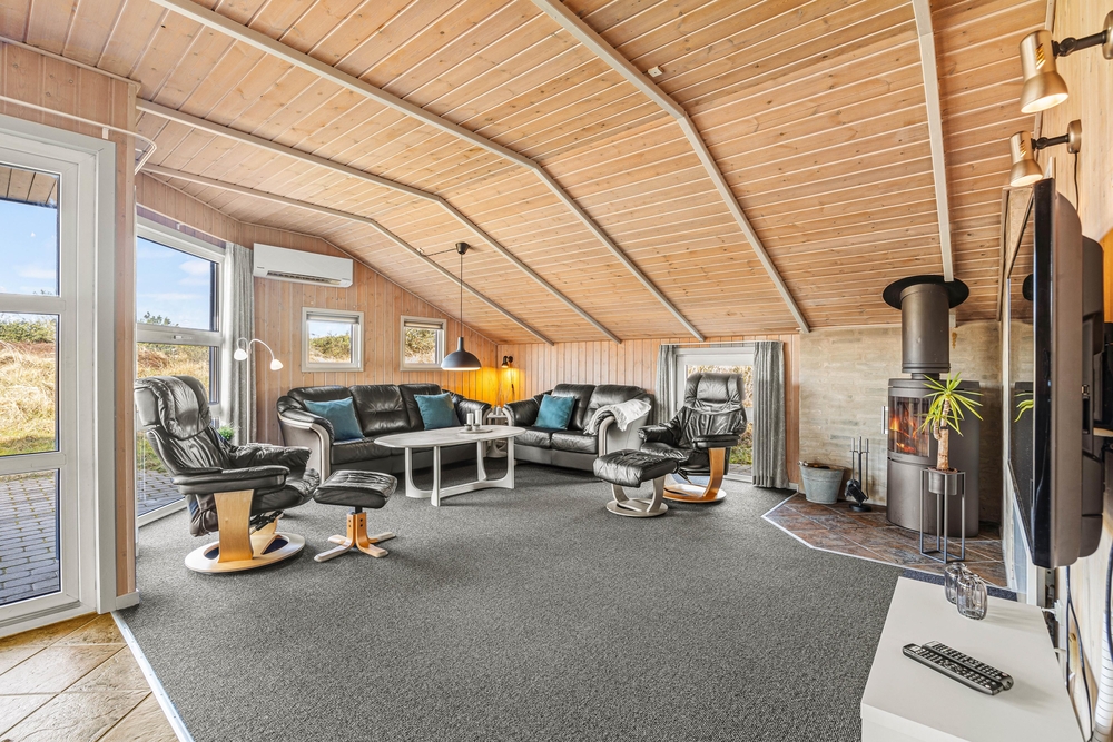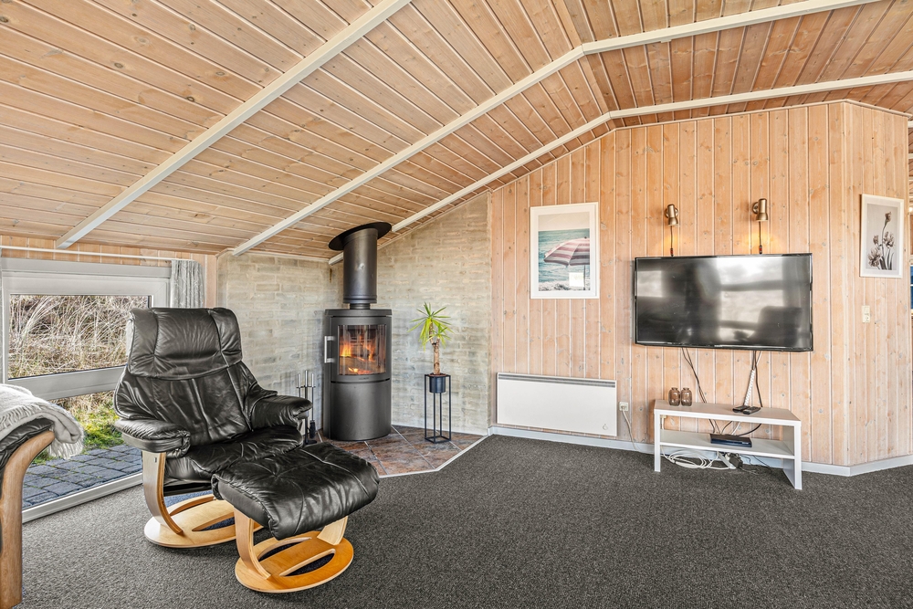 Sommerhusets samlingsrum er alrummet, hvor køkken, spiseplads og stue ligger samlet. Her kan hele familien hygge sig sammen, uanset om nogle laver mad og andre slapper af i sofaen med en film i fjernsynet. Der er danske tv-kanaler i sommerhuset. I stuen er der en brændeovn, som I kan tænde op i for varme og ekstra hyggelig stemning. I kan også benytte jer af varmepumpen i rummet til at holde en behagelig temperatur.
