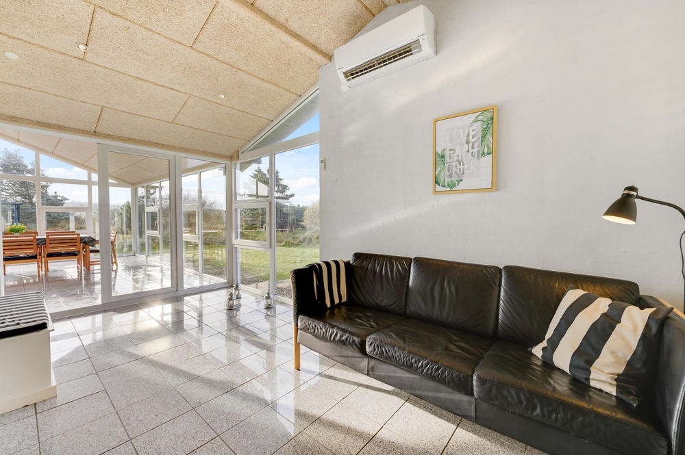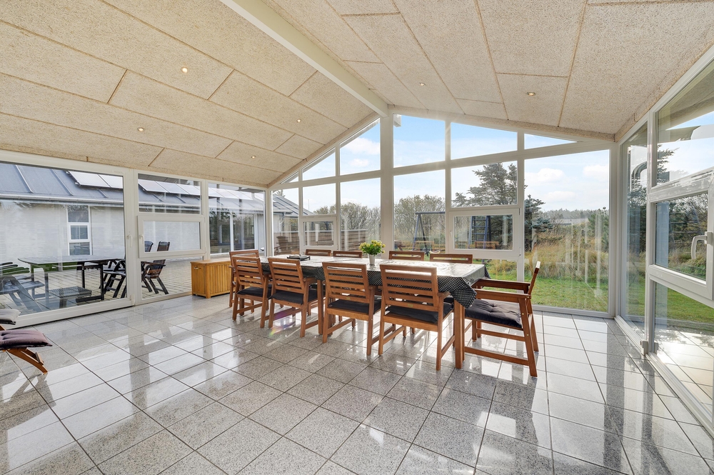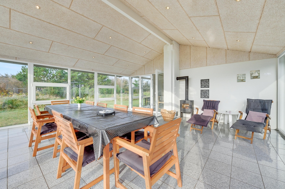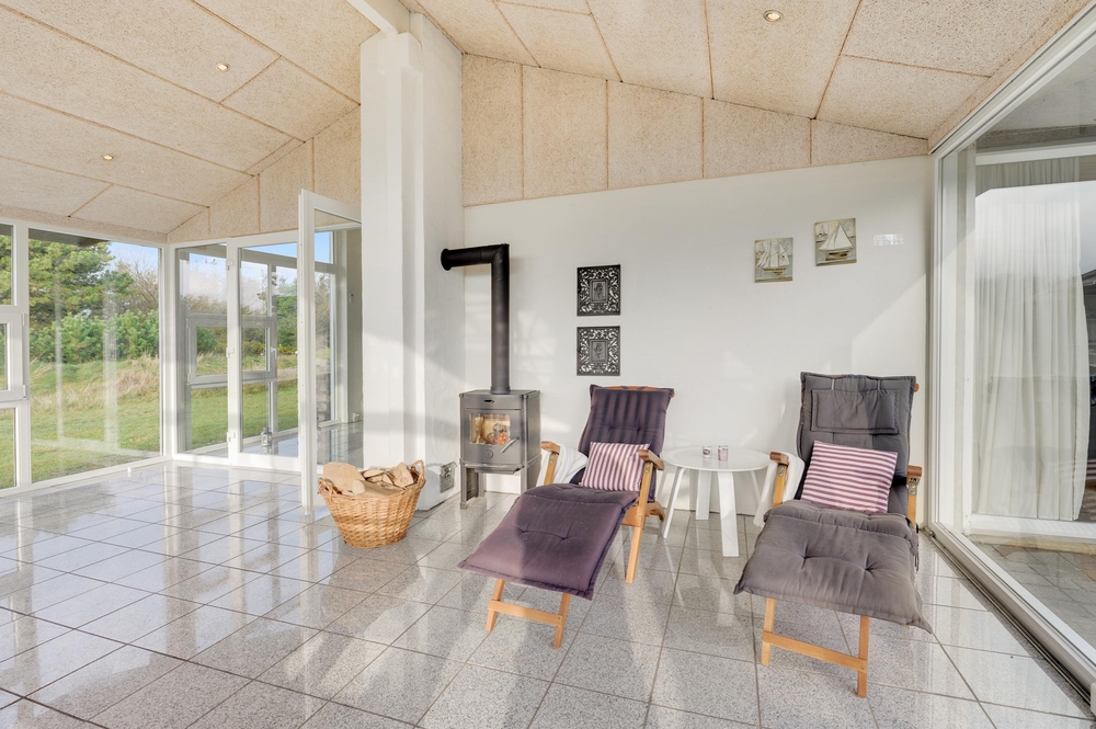 Sommerhuset har også en hel fantastisk havestue, så hvis vejret ikke viser sig fra sin allerbedste side, kan man nyde naturen og lyset i den flotte havestue. Der er vinduer næsten hele vejen rundt, så det føles som at være udenfor. Her er en hyggelig brændeovn så I kan nyde hyggen og varmen som en brændeovn spreder og et langbord til hele familien, der gør at I kan nyde en dejlig middag eller spilaften med jeres egne medbragte brætspil.