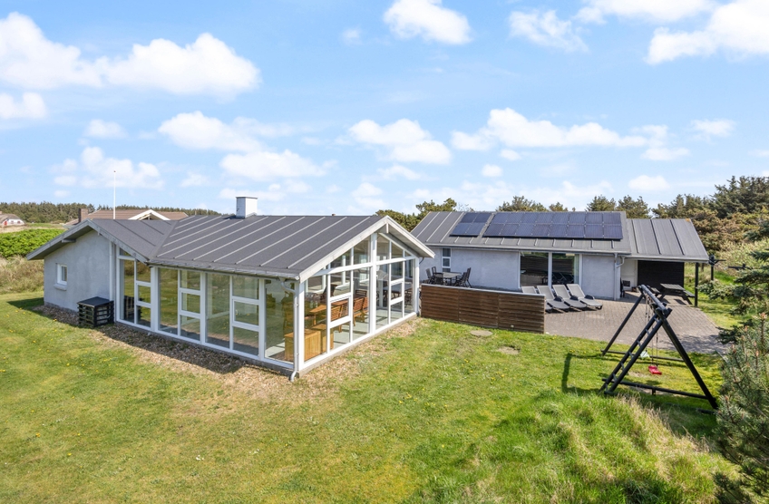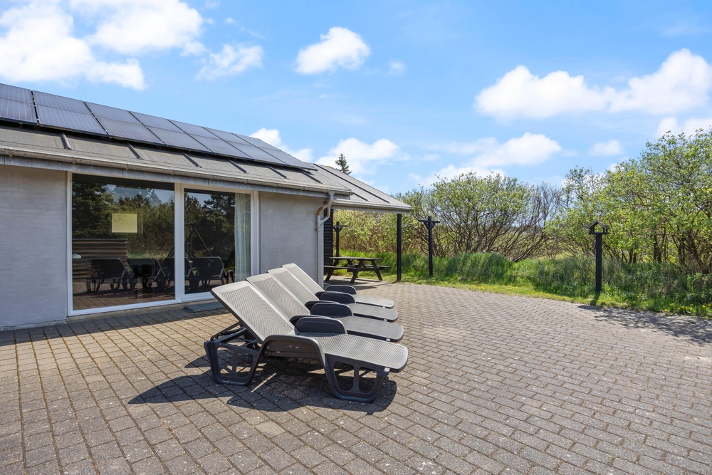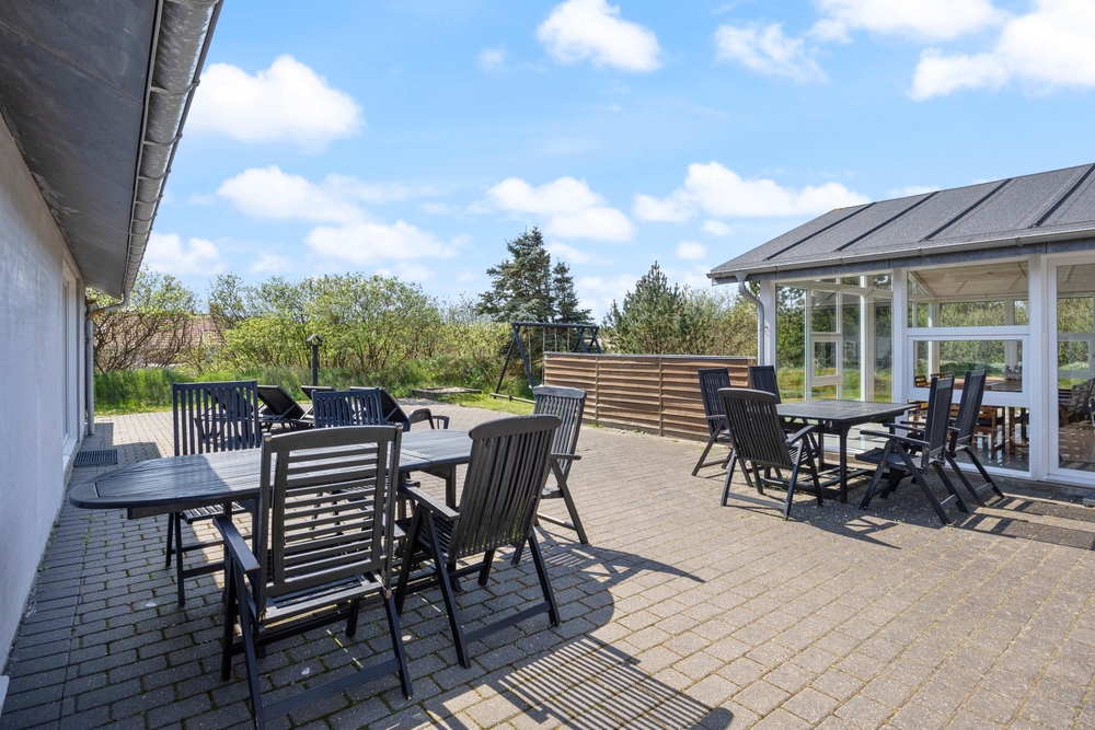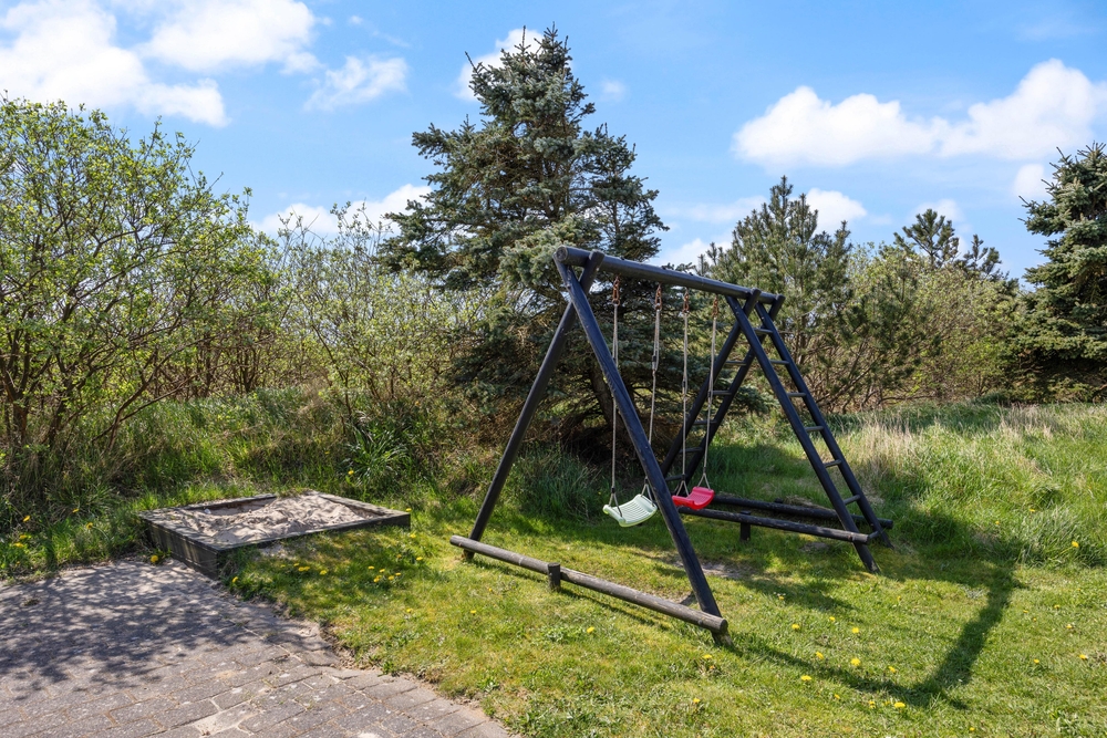 Her på Jakob Bondes Vej 69 finder I også nogle hyggelige udearealer, der indbyder til udendørs hygge. Sommerhusets skønne terrasse ligger mellem hovedhuset og tilbygningen med pool. Dette er med til at give en god afskærming for vestkystens til tider vilde vestenvind. På terrassen finder I naturligvis både havemøbler, liggestole og en grill. For de mindste gæsters fornøjelse er der opsat gynge og sandkasse.