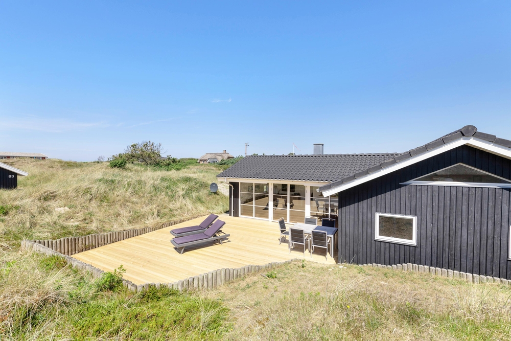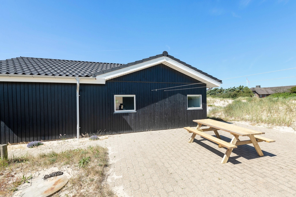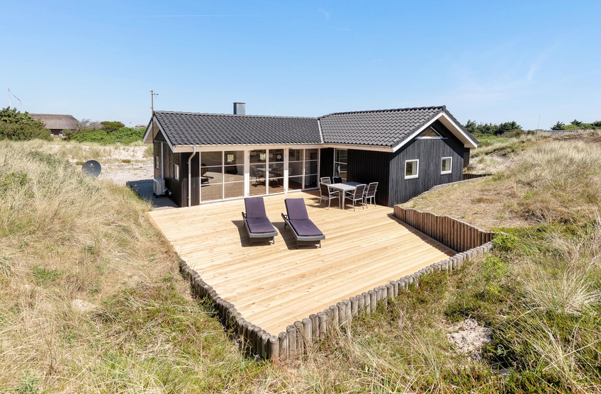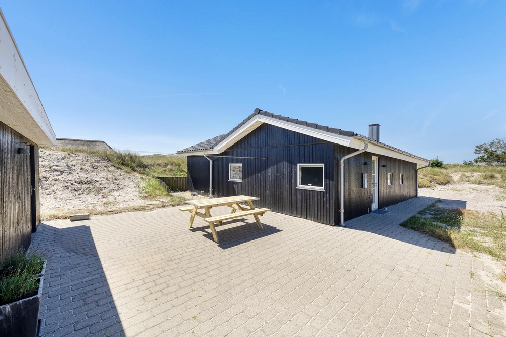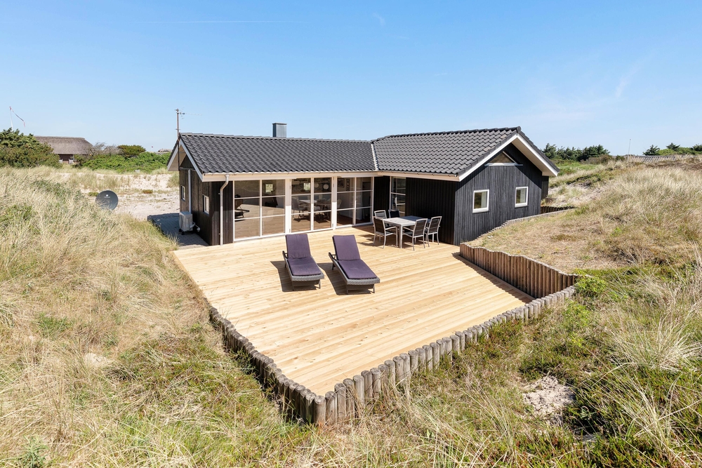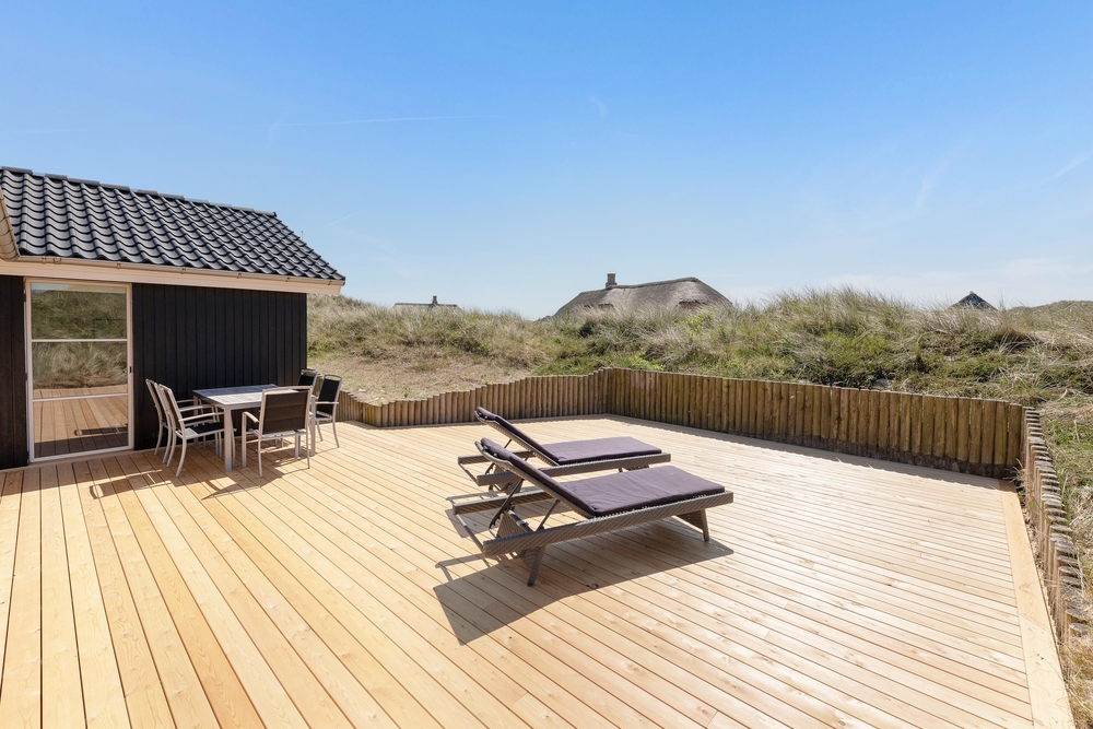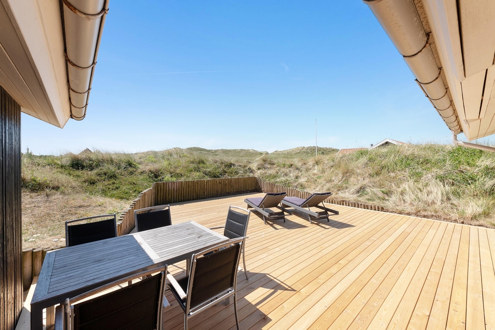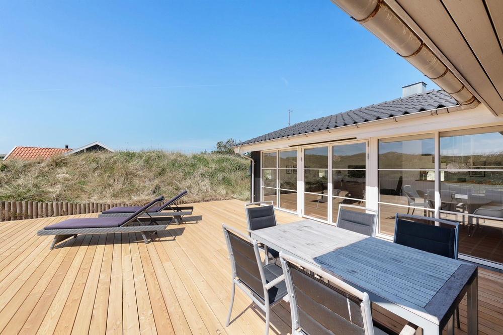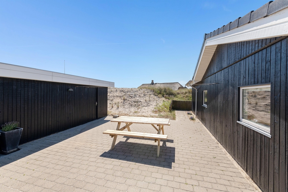 Så I til enhver tid kan nyde husets ugenerte beliggenhed midt i den skønne natur, er der flere terrasser rundt om huset. Når der rigtigt skal slappes af, er den 70m2 store sydvendte solterrasse et hit. Her er god plads til solvognene, og I ligger dejligt i læ af klitten med den fortryllende duft af hav, lyng og marehalm i næsen. Når dagen går på hæld, kan I tænde op i grillen og nyde lidt godt mad, imens solen går ned bag klitterne og de første stjerne titter frem.
