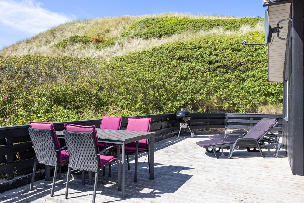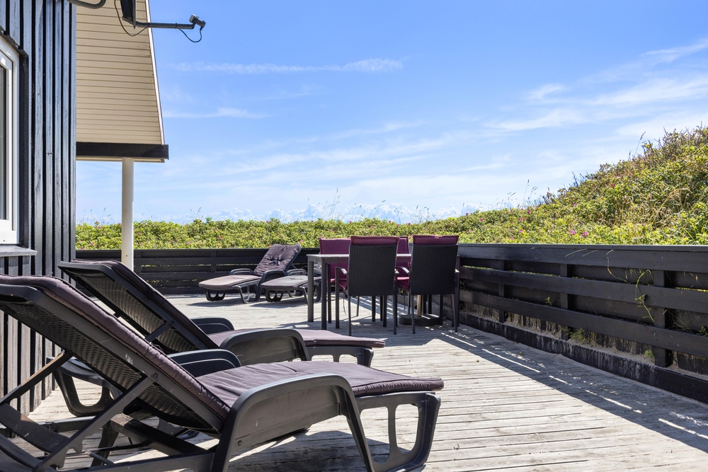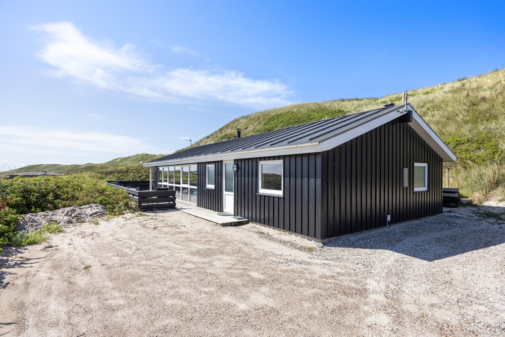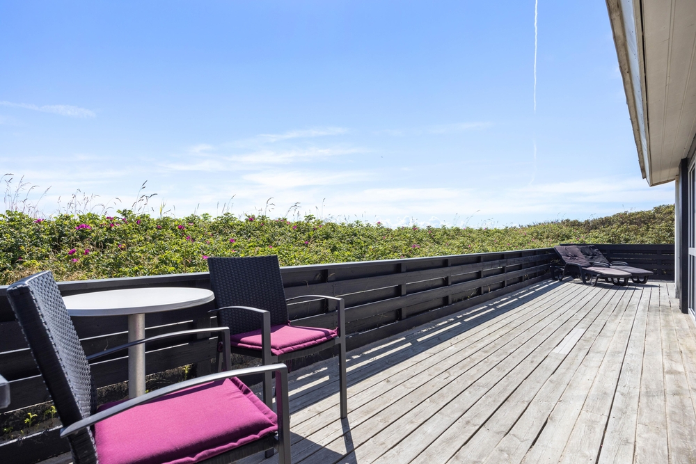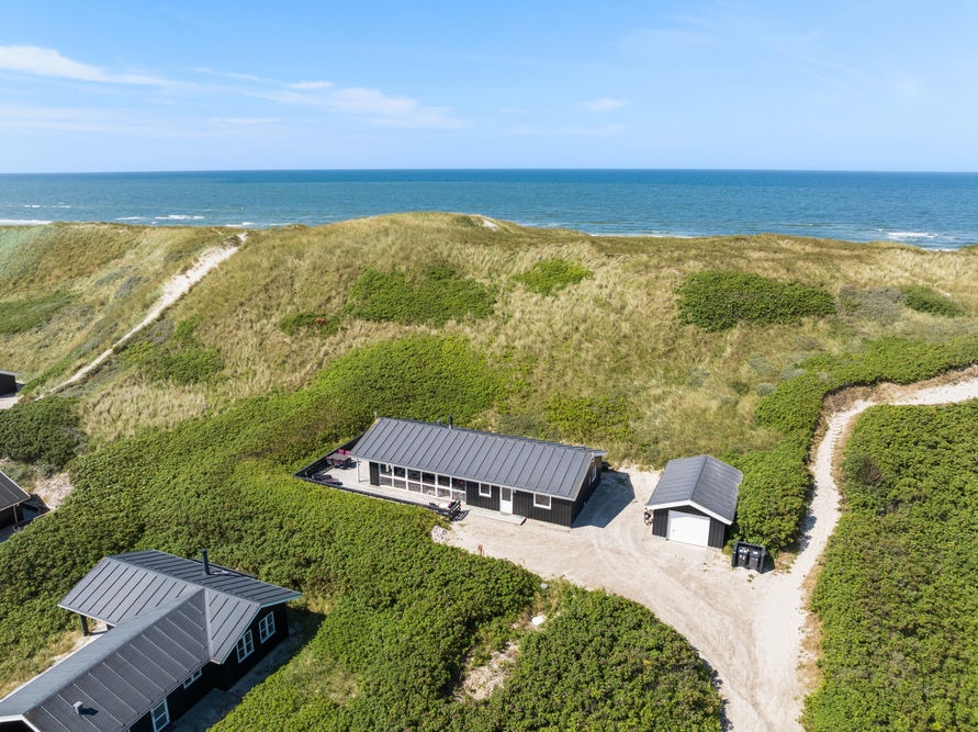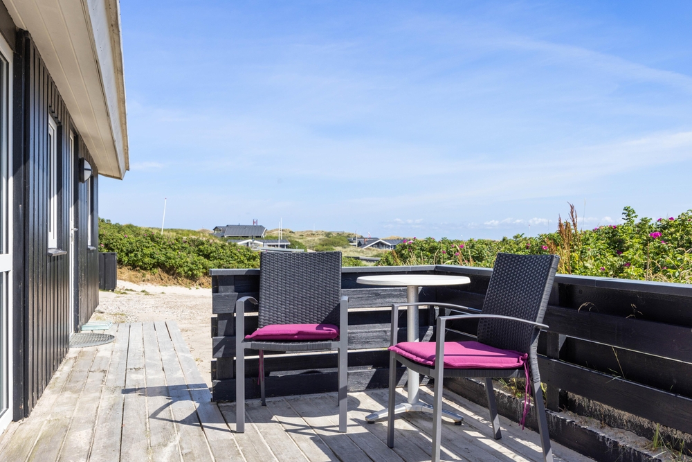 Denne perle af sommerhus ligger højt og for enden af vejen i klitterne til Vesterhavet. På den delvist afskærmede og overdækkede terrasse finder du altid den perfekte plads til at læse en god bog eller bare nyde en kop friskbrygget kaffe.