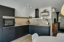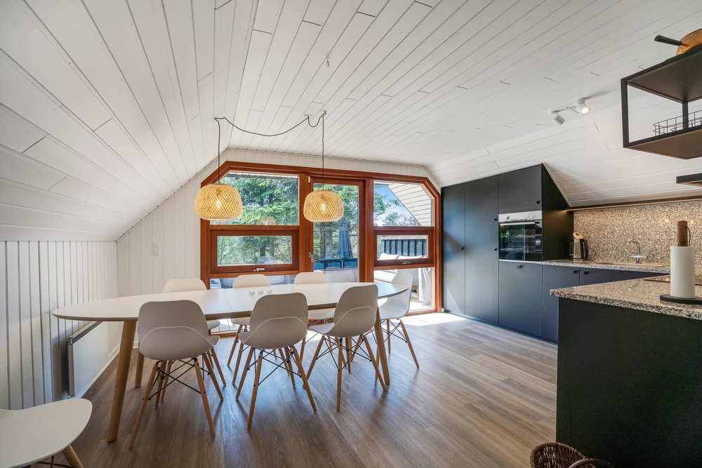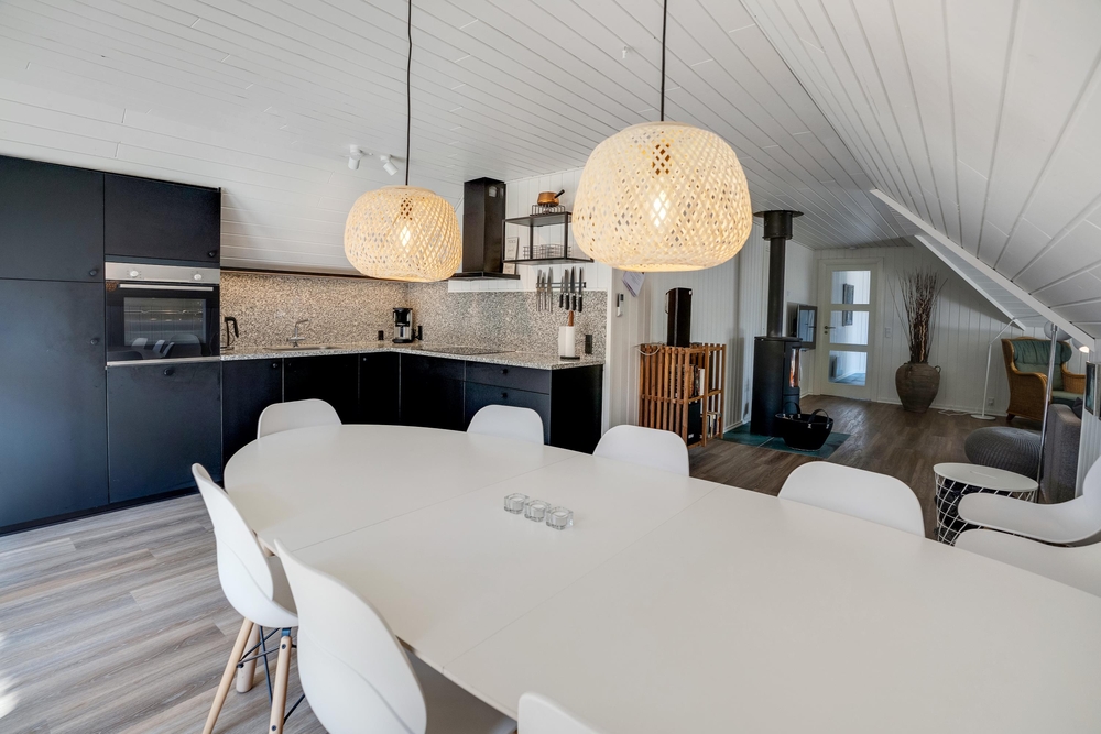 Sommerhuset er blevet renoveret i 2021, fremstår lyst og pænt og oser af sommerhusstemning og hygge, så snart man træder ind ad døren. Det er beklædt med hvide træpaneler og lofter og smukke trægulve. Indenfor er der et nyere køkken i åben forbindelse med stuen og med direkte udgang til den dejlige terrasse. På køligere dage sørger både brændeovnen i stuen og varmepumpen for, at I ikke fryser om fødderne. Der er gratis internet, fladskærms tv og Chromecast i feriehuset.