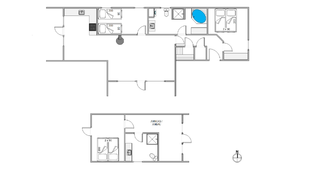 Sommerhuset har 3 soverum, hvoraf de 2 er med dobbeltsenge. Der er 2 lækre badeværelser med moderne hjælpemidler som tørretumbler og vaskemaskine. Fra det ene badeværelse har I adgang til sommerhusets sauna og spa, som giver en følelse af wellness og afslapning på ferien.