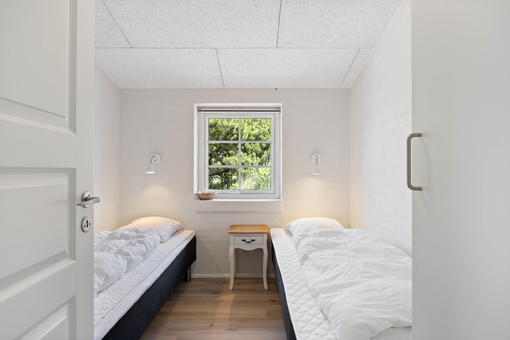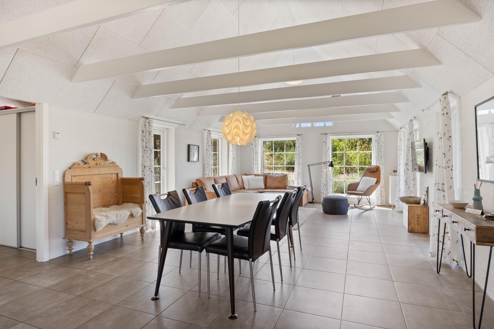 Jens Jensens Vej 46 byder jer velkommen med en lys og moderne indretning. Der er lyse loftbjælker op til kip, som giver ægte sommerhusstemning. Selve sommerhuset er fordelt på 3 soveværelser, hvoraf de 2 har dobbeltsenge. Det ene soveværelse har desuden direkte udgang til terrassen der omgiver huset.