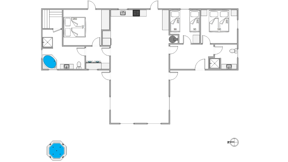 Sommerhusets hjerterum er uden tvivl det dejlige, lyse køkken hvor I også finder brændeovnen. Køkkenet er i direkte forbindelse med opholdsstuen og stuen, hvor I kan samles og hygge jer mens der laves mad eller spilles spil alt imens brændeovnen skaber ægte sommerhushygge. Sommerhuset har hele 2 badeværelser, så der ikke opstår kø om morgenen for jer ved den daglige morgenrutine. Det ene badeværelse har både sauna og spa og giver følelsen af velvære og wellness på ferien. Her vil I uden tvivl komme til at tilbringe mange dejlige feriestunder.