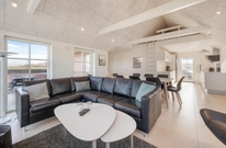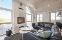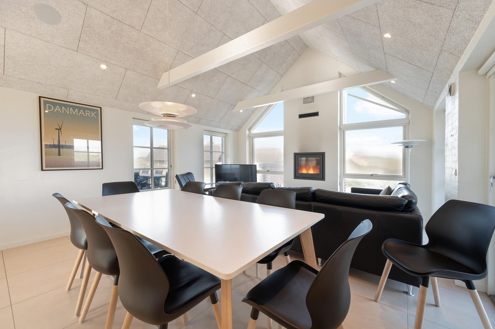 Husets hjerte er uden tvivl det store, lyse alrum med det enestående udsyn mod første klitrække. I stueafdelingen kan I nyde den flotte indbyggede brændeovn, der er et centerpiece i stuen. Den knitrende ild bidrager virkelig til den hyggelige feriestemning. Alrummet er indrettet med smagfulde møbler i sort-hvide nuancer, der giver et eksklusivt og smagfuldt udtryk. I selve stueafdelingen finder I både fladskærms-tv, DVD, radio og CD-afspiller.