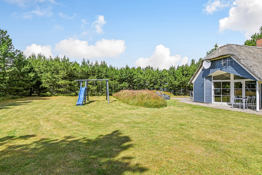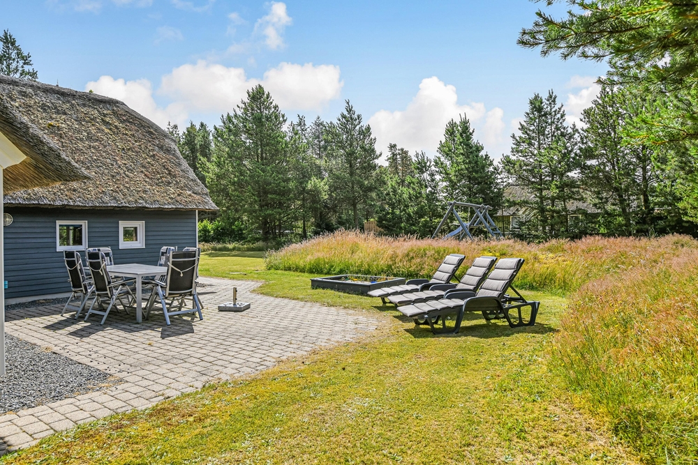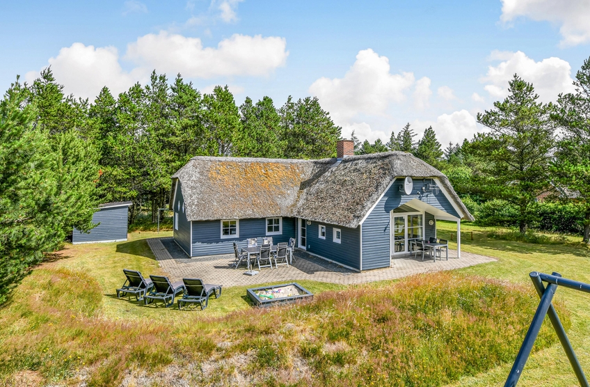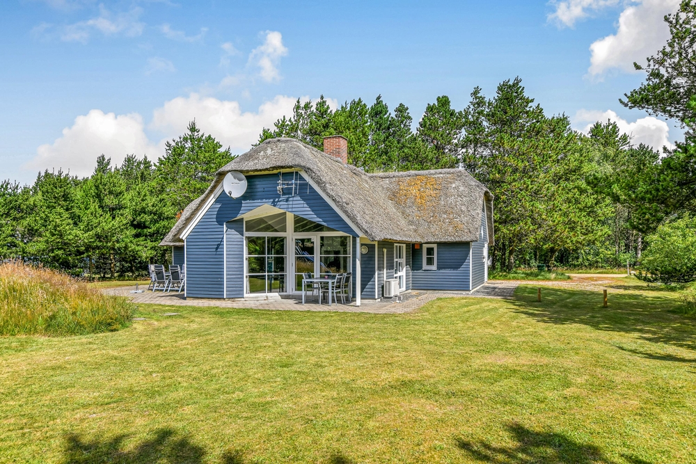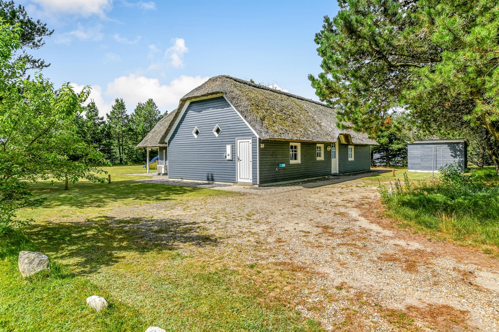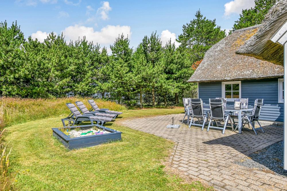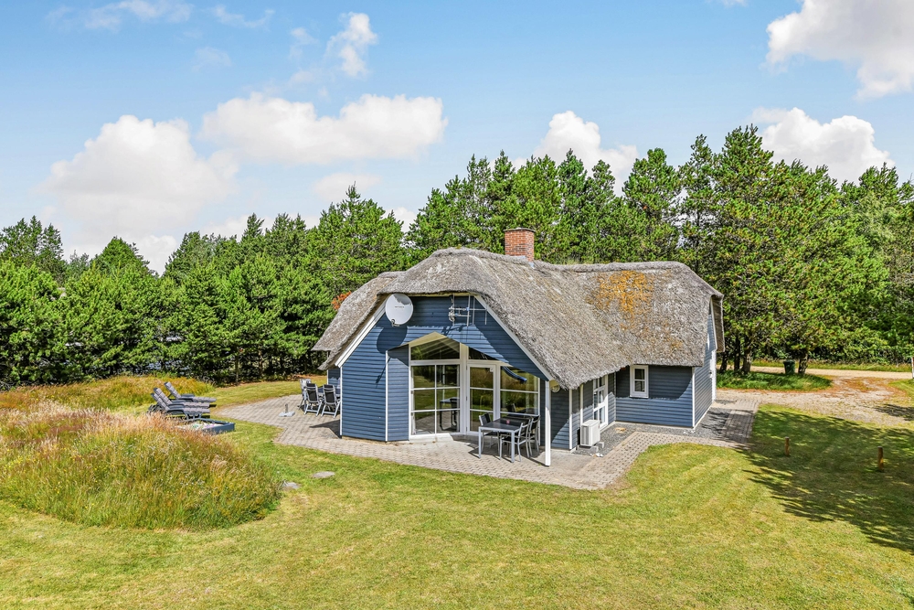 Det blå stråtagshus står midt på en skøn naturgrund i Houstrup, kun få meter fra det fredede naturområde og omgivet af fyrreskoven. Rundt om huset finder I 2 terrasser, hvor I kan nyde solskinsdagene, spise en god frokost, eller holde en grillaften med hele familien. Til børnene er der masser af plads til leg i haven, og her finder de også både en sandkasse og et gyngestativ.