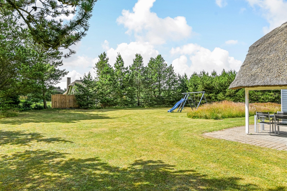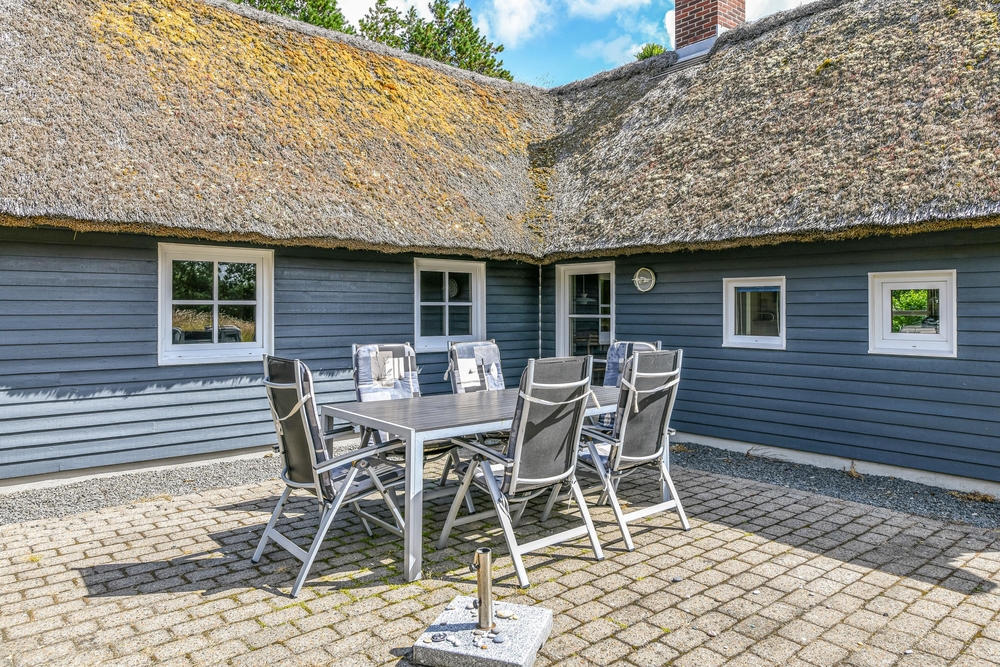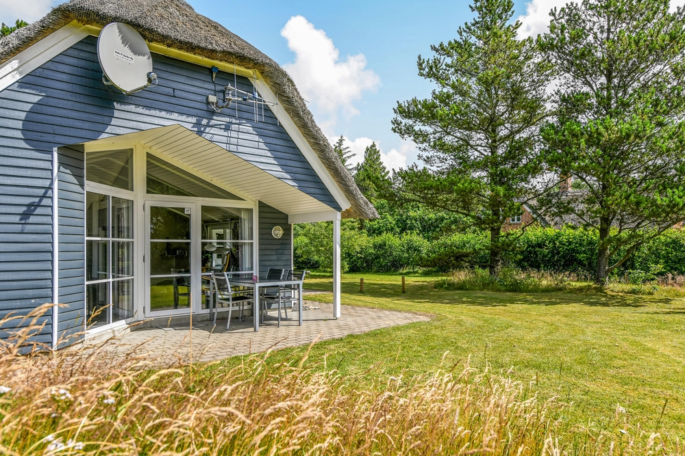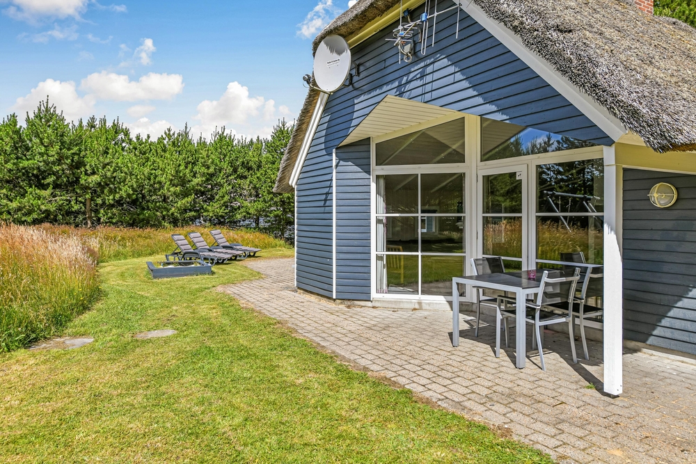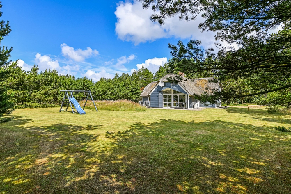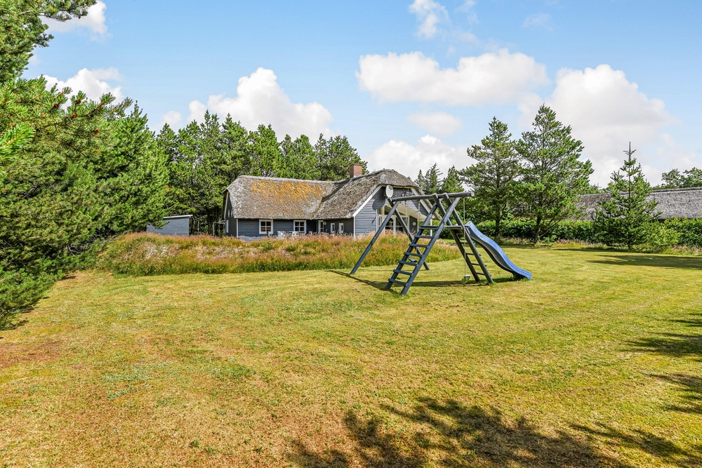 Det blå stråtagshus står midt på en skøn naturgrund i Houstrup, kun få meter fra det fredede naturområde og omgivet af fyrreskoven. Rundt om huset finder I 2 terrasser, hvor I kan nyde solskinsdagene, spise en god frokost, eller holde en grillaften med hele familien. Til børnene er der masser af plads til leg i haven, og her finder de også både en sandkasse og et gyngestativ.
