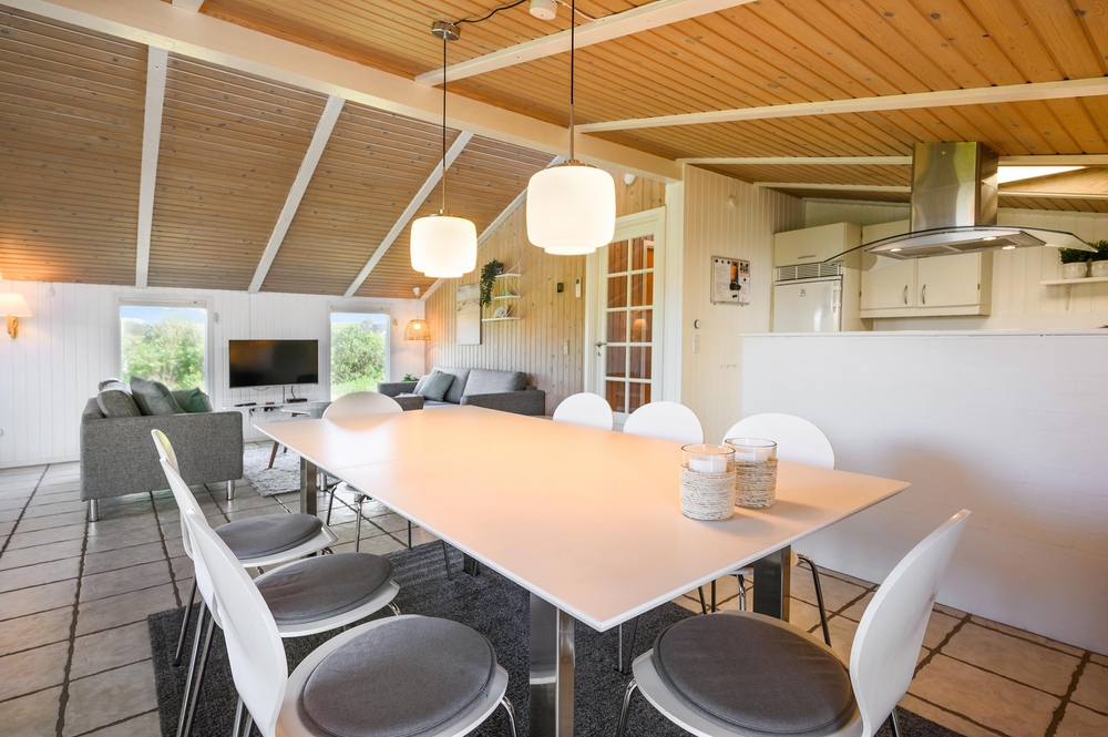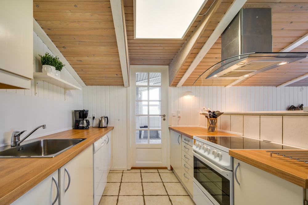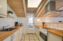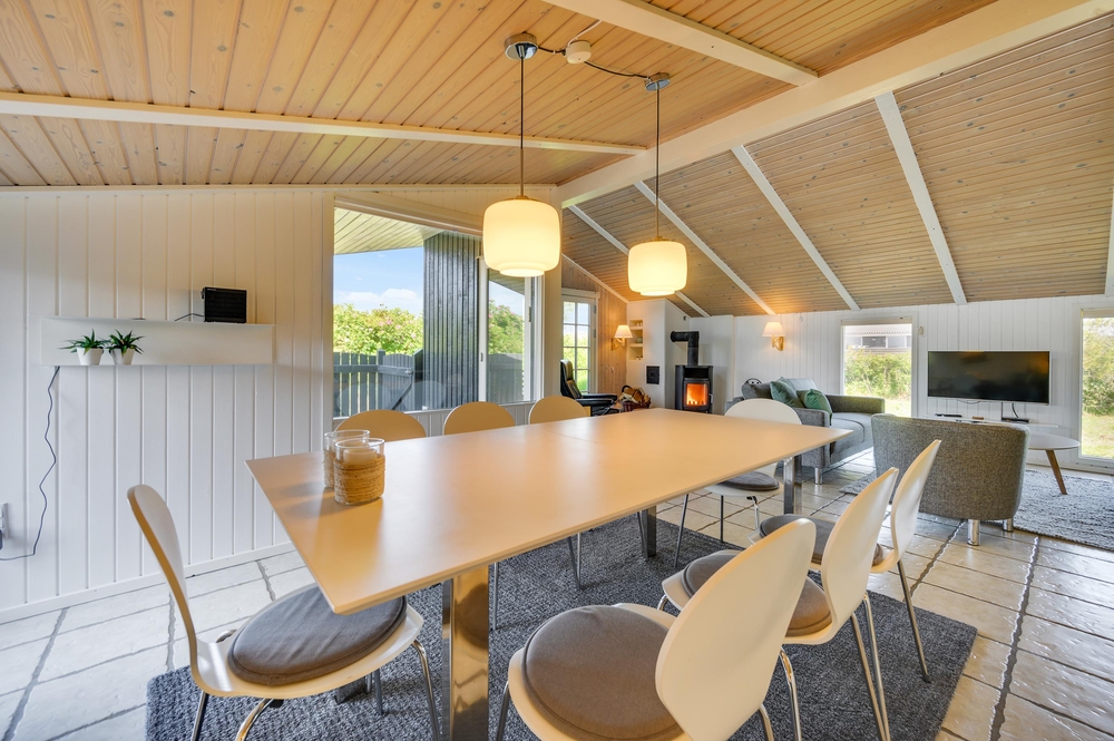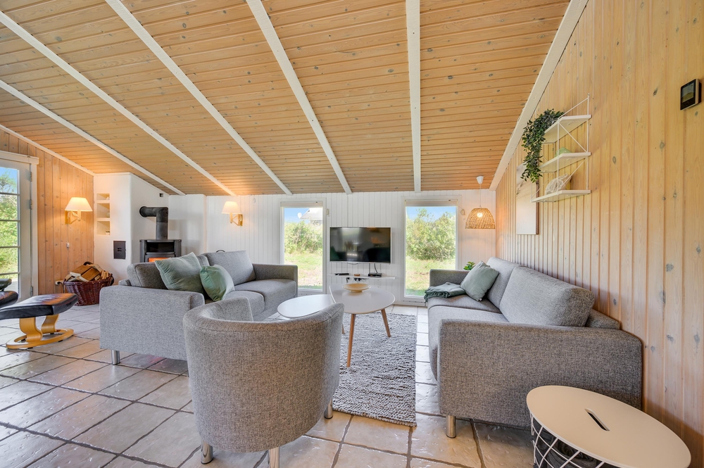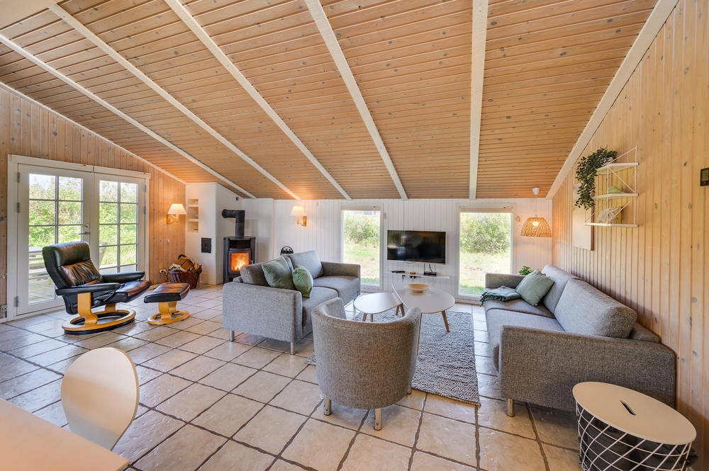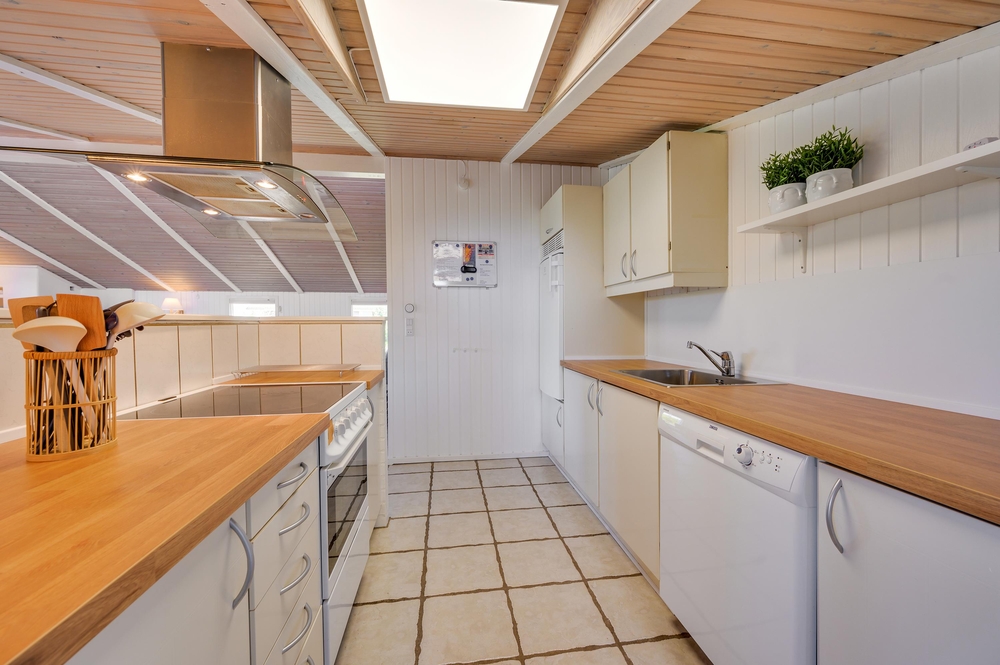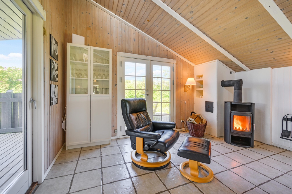 Køkken-alrummet er hjertet i sommerhuset. Loftshøjden gør stuen dejlig rummelig og lys og her finder du både brændeovn og en god, stor sofa, hvor familien kan samles om et spil eller en god eftermiddagskage. Køkkenet har god plads og er lyst og pænt indrettet. Her er alt det, du skal bruge for at kunne tilberede en lækker middag til familien.