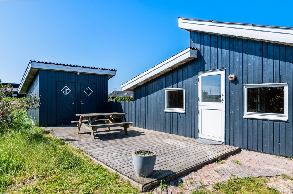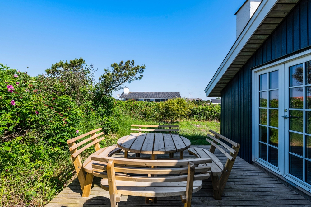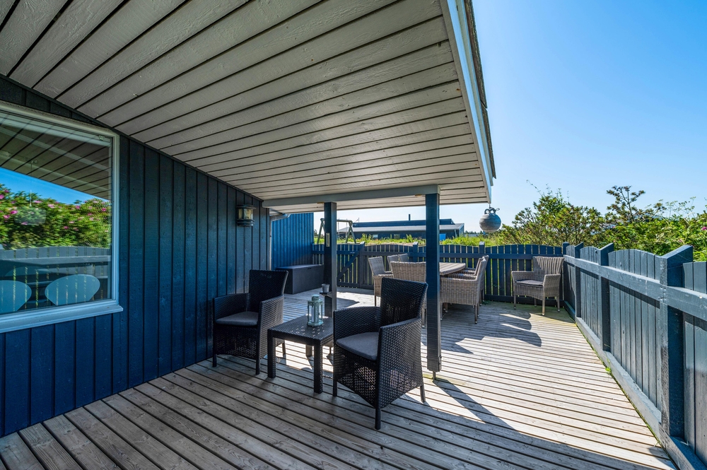 Rundt om sommerhuset finder I mange gode hyggekroge på de 3 terrasser og der er altid en terrasse med læ. En del af den sydvestvendte terrasse er overdækket, hvilket forlænger de lune sommeraftener på terrassen. Overdækningen sørger nemlig for at holde på varmen. Den giver samtidig også læ for vejr og vind allerede fra de tidlige forårsdage. Desuden er denne terrasse lukket.