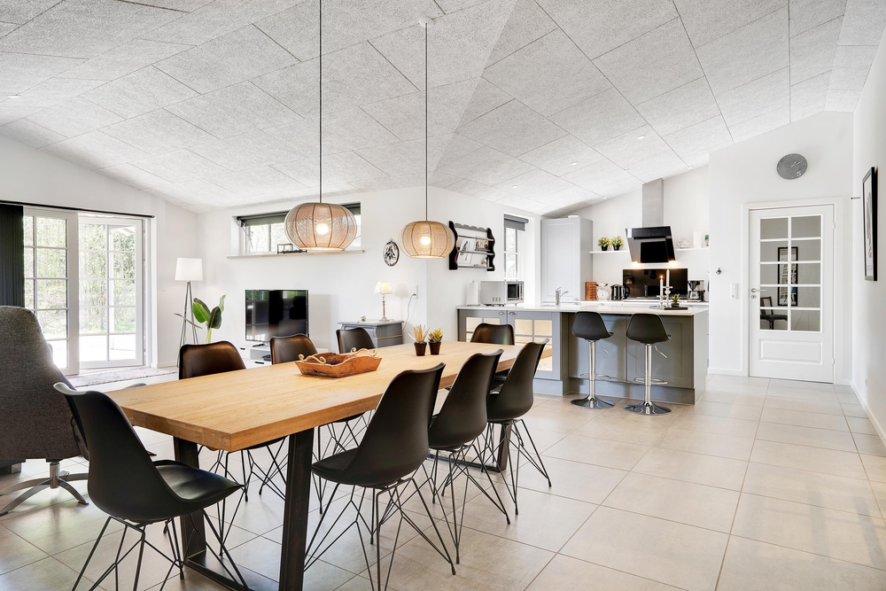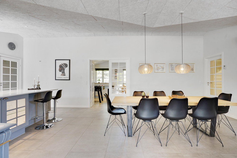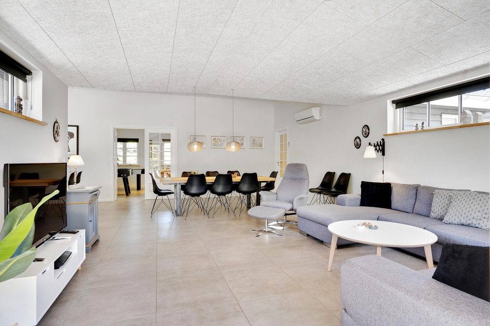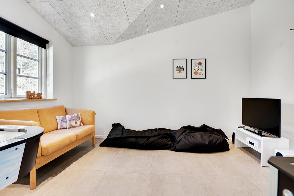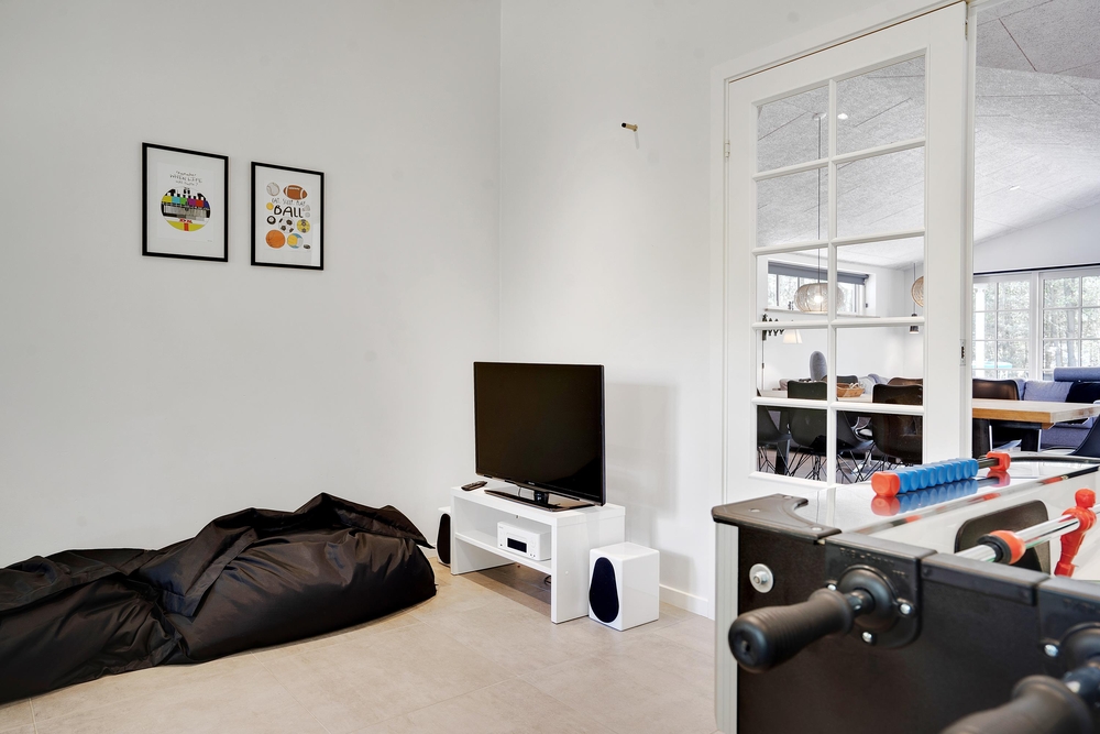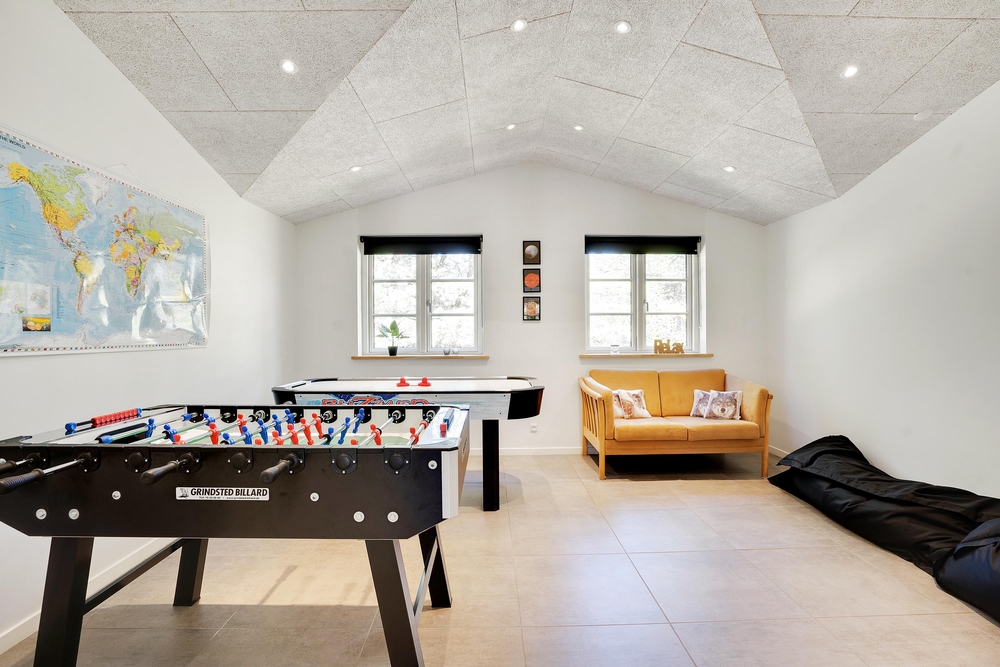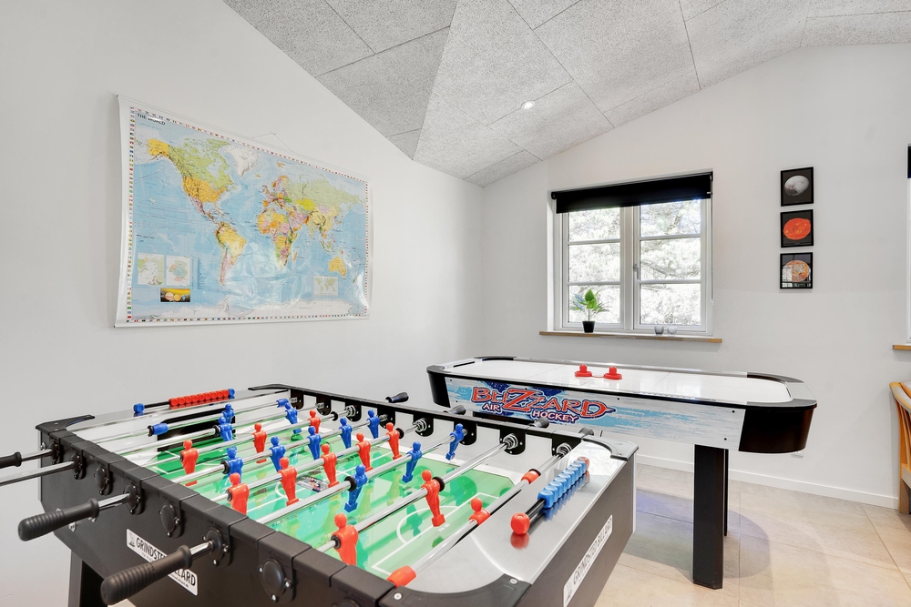 Der er gjort meget ud af, at alle skal befinde sig vel i feriehuset; fra det åbne stue- og køkkenområde kommer man ind i de konkurrenceglade gæsters base, aktivitetsrummet, hvor der både står et airhockeybord og et spil bordfodbold til rådighed. Her kan I rigtig slå jer løs og udfordre hinanden på kryds og tværs.