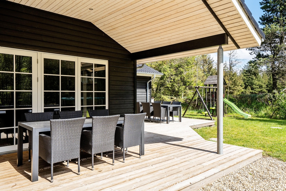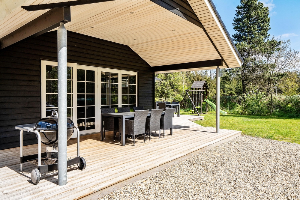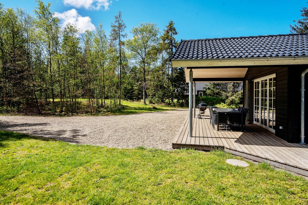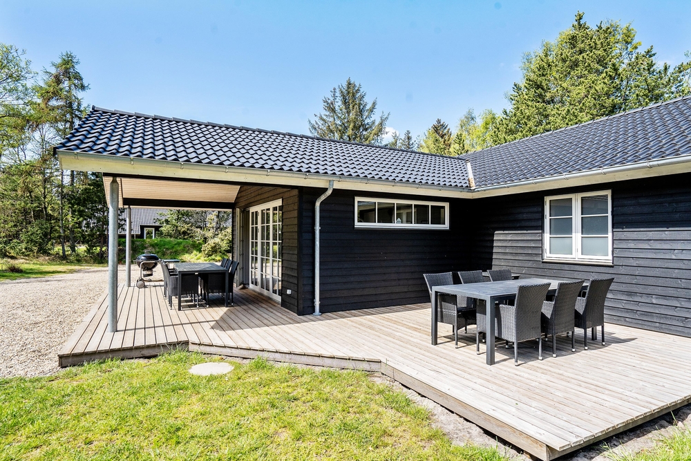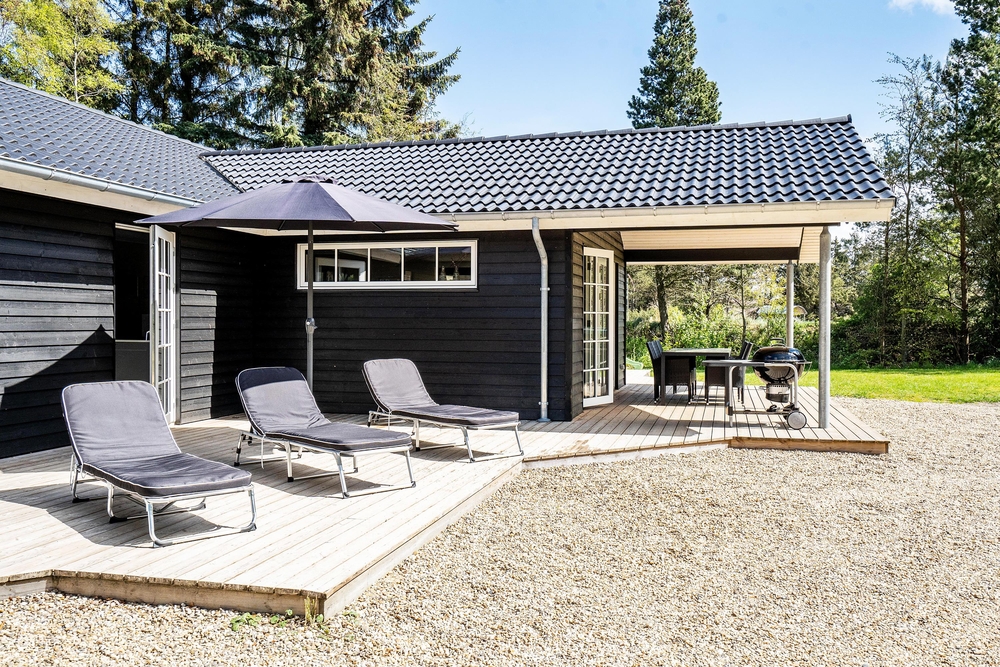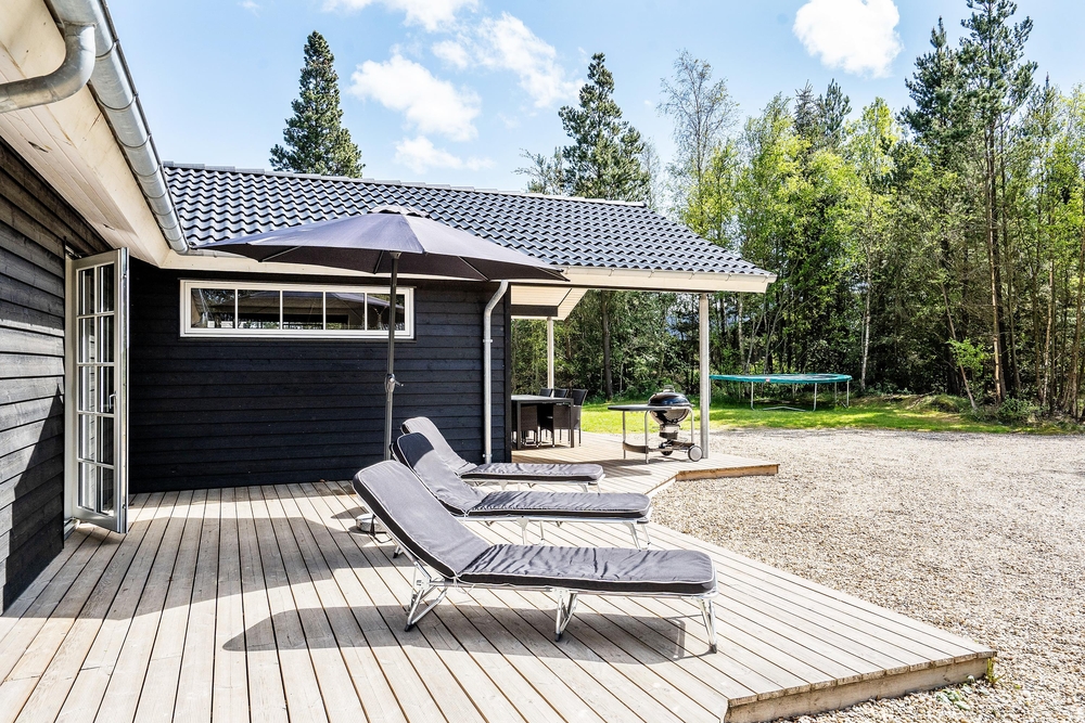 Rundt om feriehuset på de skønne terrasser finder alle hurtigt en plads i solen ? eller skyggen under den overdækkede del af terrassen, hvis man er mere til det. De gode havemøbler og liggestole sørger for, at I kan nyde den friske luft og det gode vejr i fulde drag, og de høje træer, der omgiver grunden, giver jer en fantastisk, rolig beliggenhed.