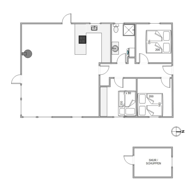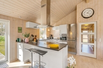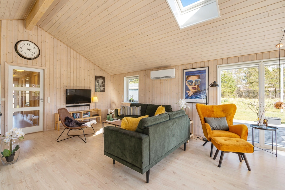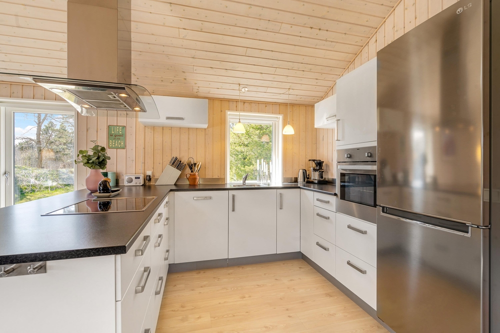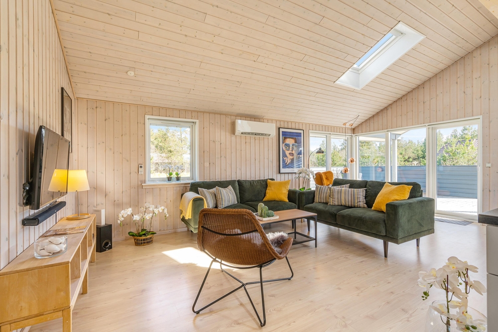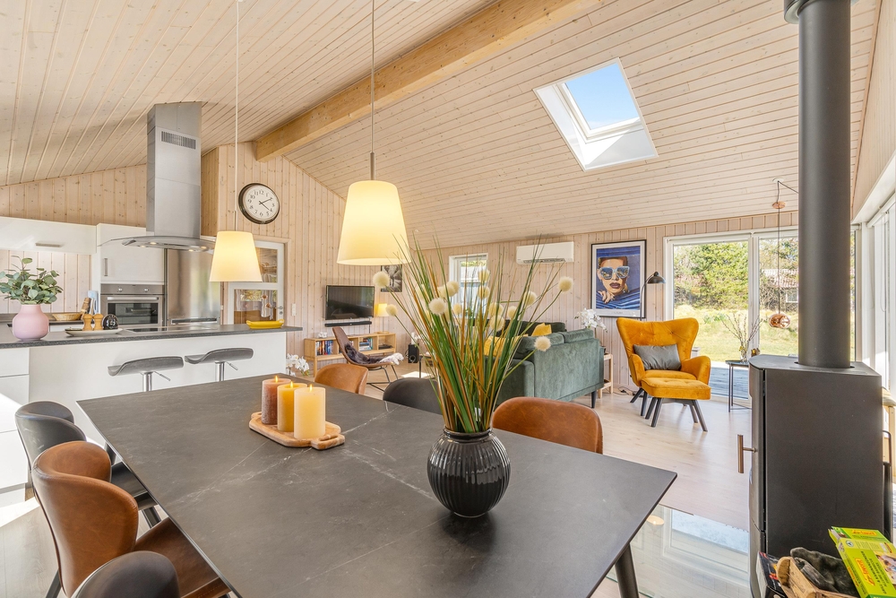Hjertet i sommerhuset er alrummet, der samler køkken, stue og spiseplads i ét, hvor rammerne er sat for hyggelige stunder med hele ferieflokken. Her kan I lave god mad i køkkenet, spille et sjovt spil ved bordet eller streame jeres yndlingsfilm i tv?et via Chromecasten. Alt sammen akkompagneres af brændeovnens knitrende flammer i baggrunden, der fuldender feriestemningen.