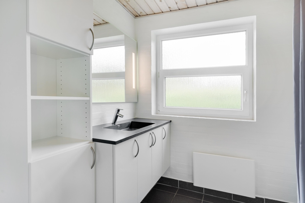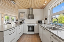 Køkkenet er åbnet op ind til spisestuen, og de store vinduespartier kaster masser af lys ind og gør rummet endnu større og lysere. Køkkenet er veludstyret, og udover opvaskemaskine og mikroovn byder køkkenet på en separat fryser på 80liter til at kunne tage sig af jeres indkøb.