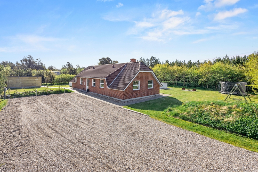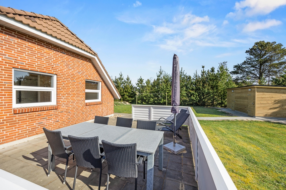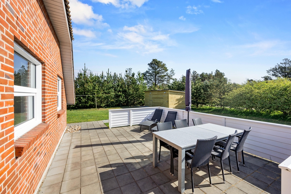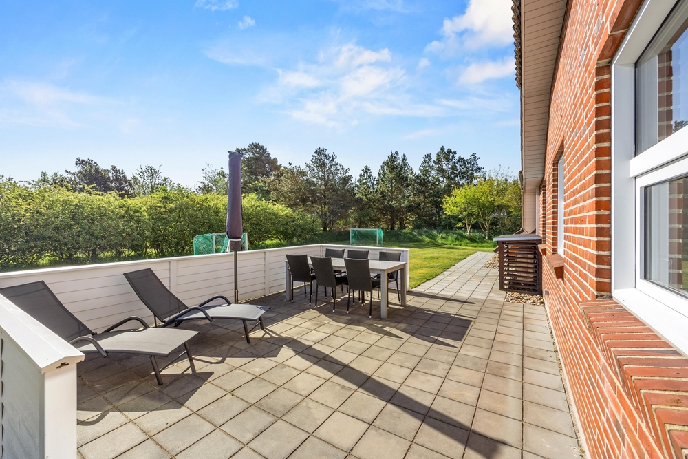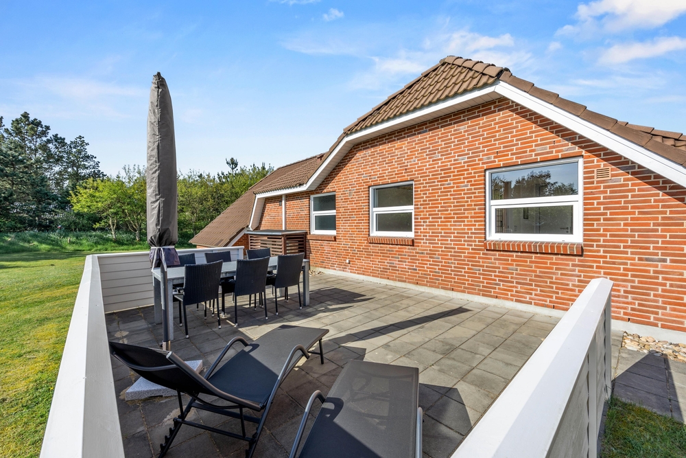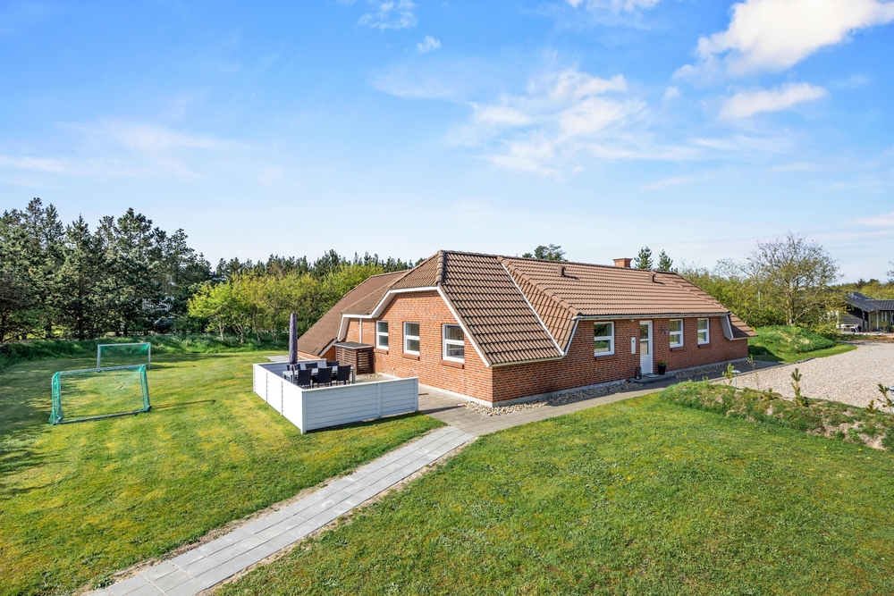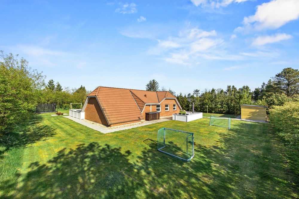Gennem stuen kommer I ud på den hyggelige terrasse, hvor havemøblerne og grillen er sat frem til at skabe den rette feriestemning. Sommerhuset er omgivet af en stor grøn græsplæne, hvor børnene kan slå sig løs ved at gynge, sandkasse og fodboldmål, mens I slapper af i solen.