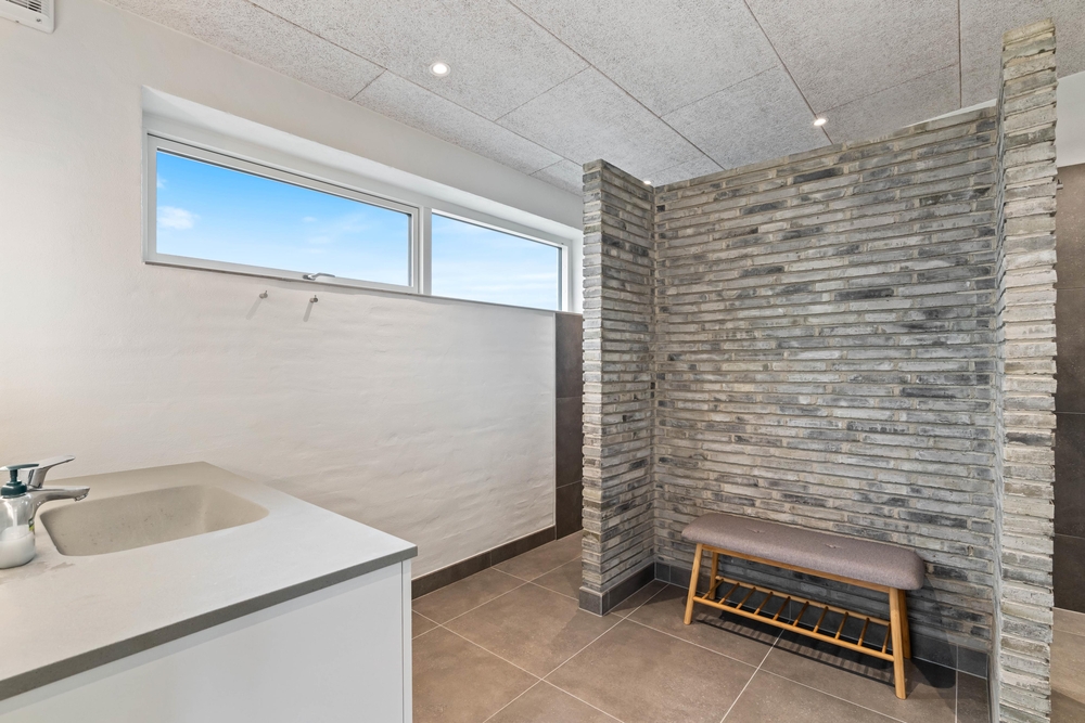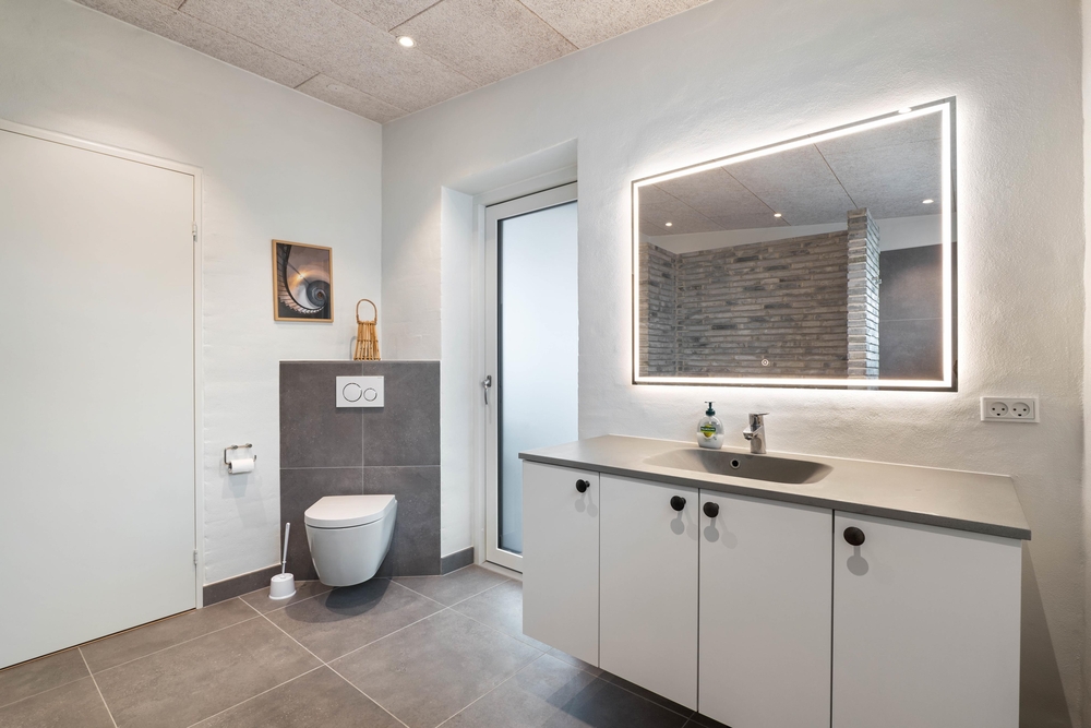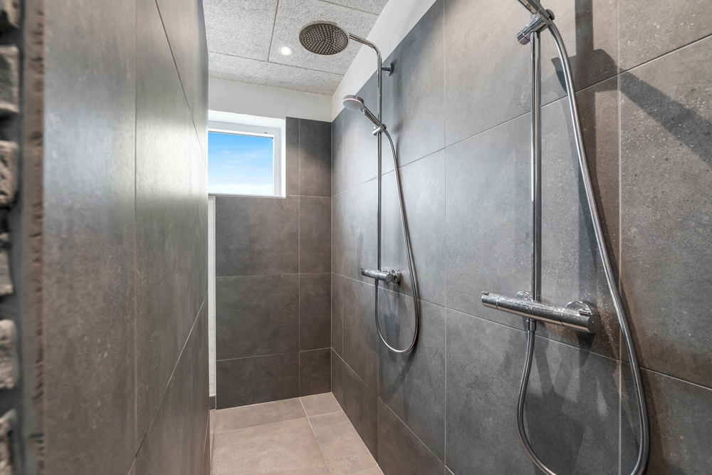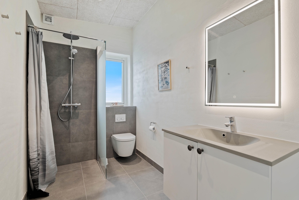 Sommerhuset har hele 2 badeværelser, så der ikke opstår kø fra morgenstunden. Begge badeværelser er udstyret med gulvvarme. Her er desuden både vaskemaskine og tørretumbler.
