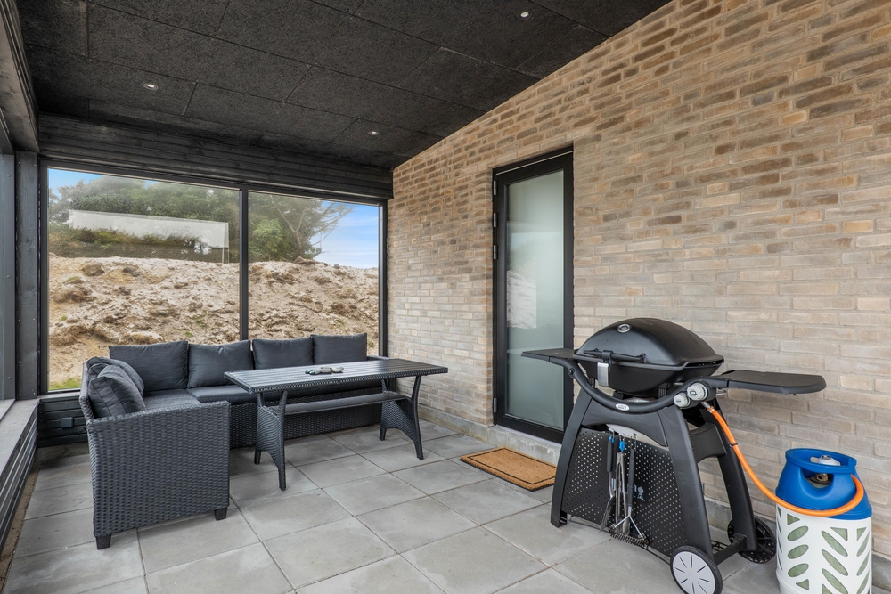 Sommerhuset har en skøn, overdækket terrasse, hvor I kan nyde mange hyggelige timer med hele familien. En god feriedag kan afsluttes på bedste vis med en god grillmiddag lavet på feriehusets gasgrill.
