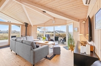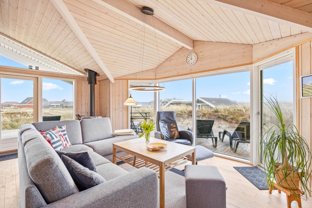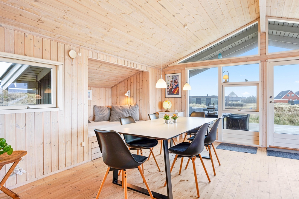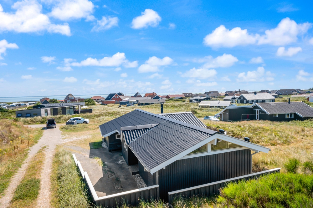Sommerhuset ligger på en af de karakteristiske klitgrunde i feriehusområdet Årgab. Fra husets delvist overdækkede terrasse kan I nyde udsigten over det dejlige område, mens I nyder morgenmaden i det fri på terrassen i sommerhusets fine havemøbler.