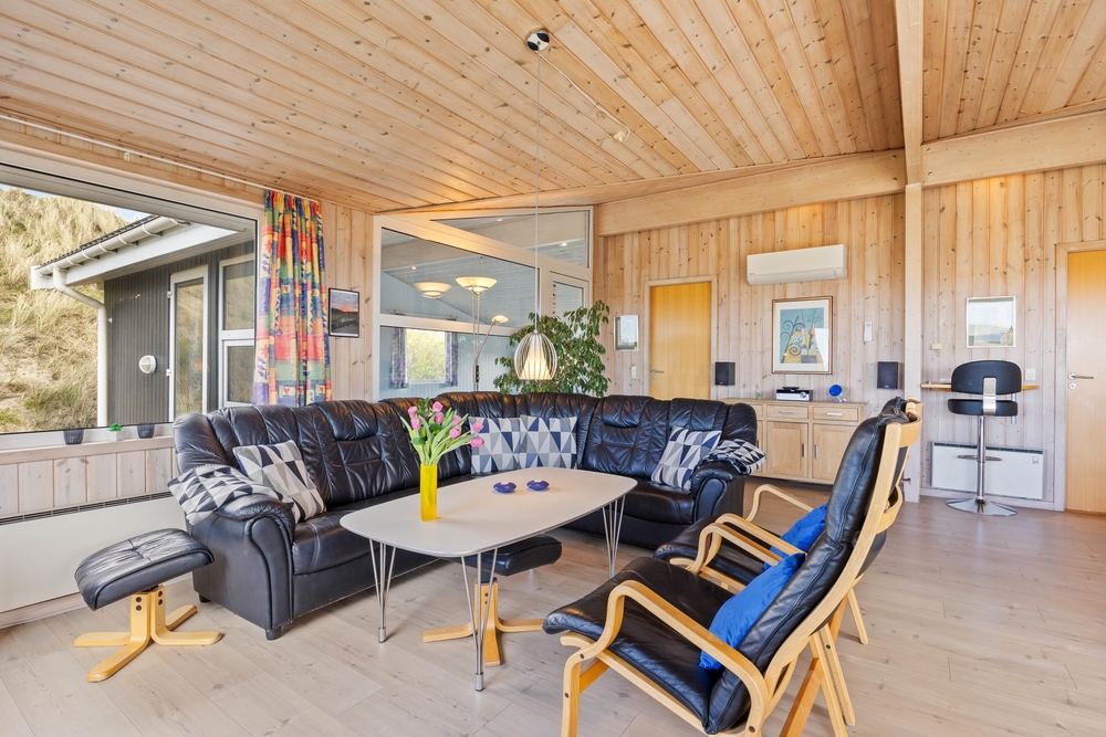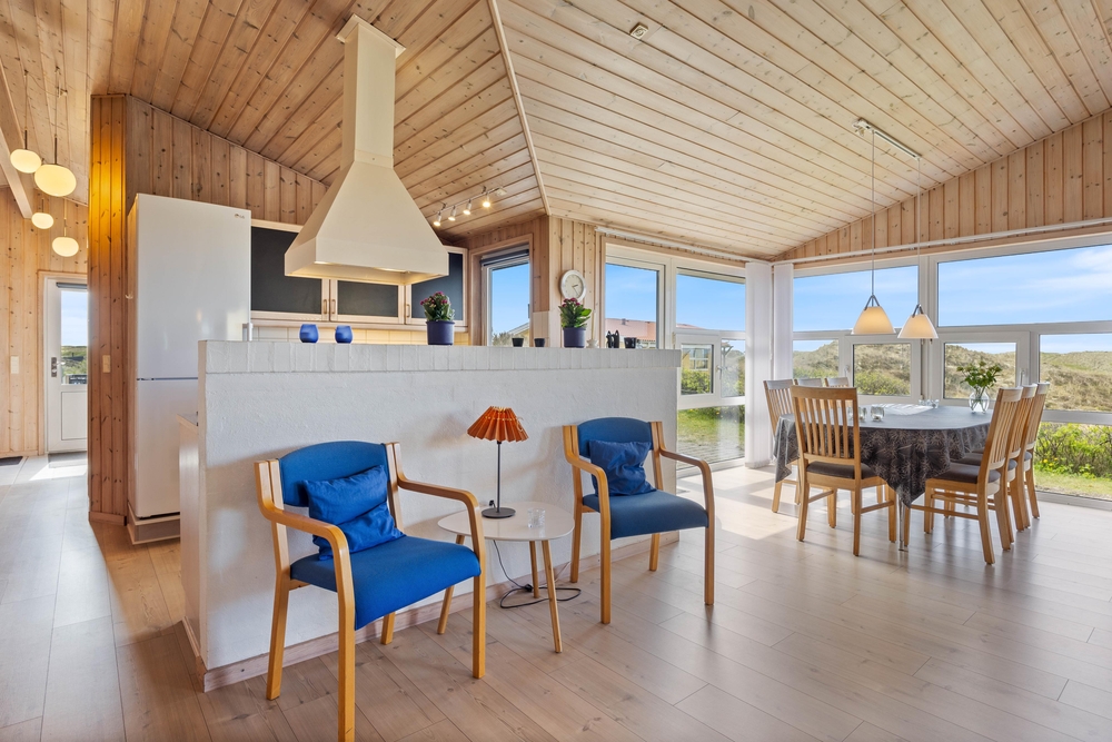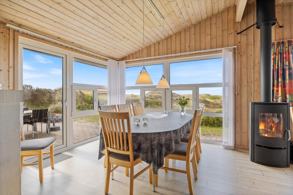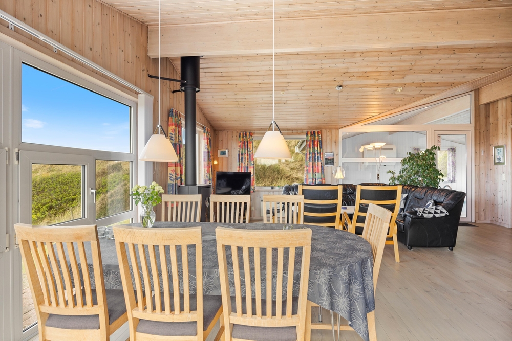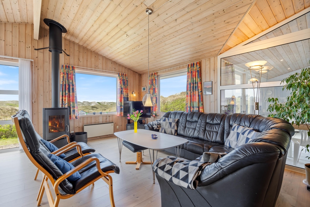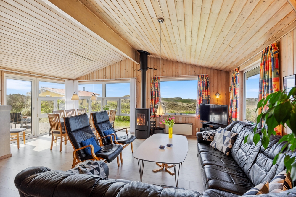 Når I træder ind i dette hyggelige feriehus, vil I med det samme mærke den hyggelige atmosfære, som trævæggene og -loftet skaber. I stuen kan I læne jer tilbage i sofaen og nyde den skønne udsigt udover klitlandskabet, mens brændeovnen giver jer en dejlig varme. Udover brændeovnen finder I også en varmepumpe i feriehuset, som er med til at sørge for, at I har en dejlig temperatur i feriehuset.