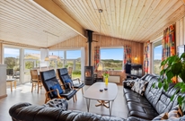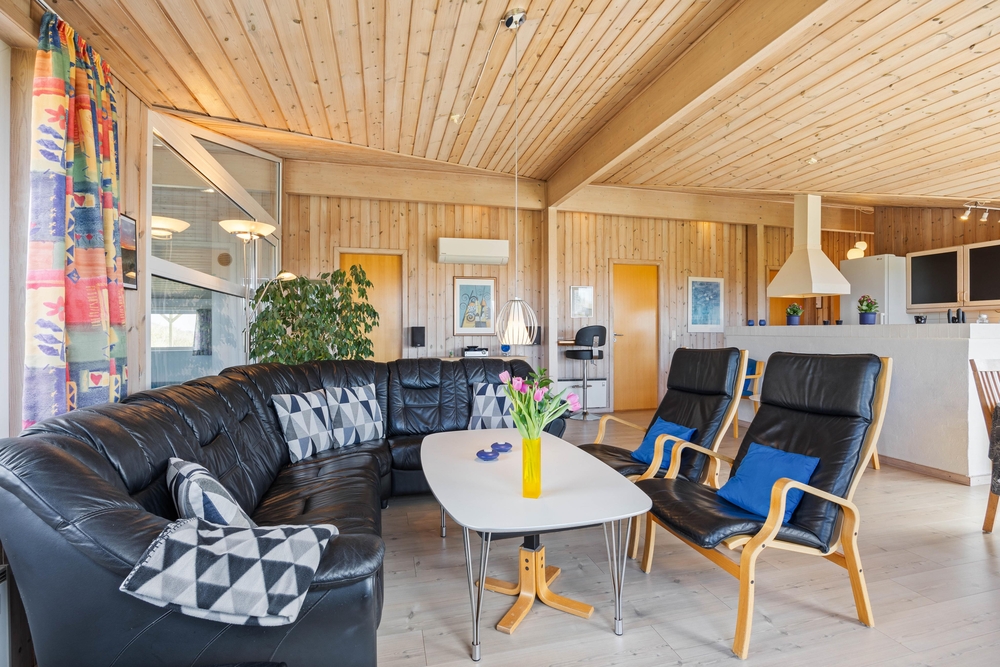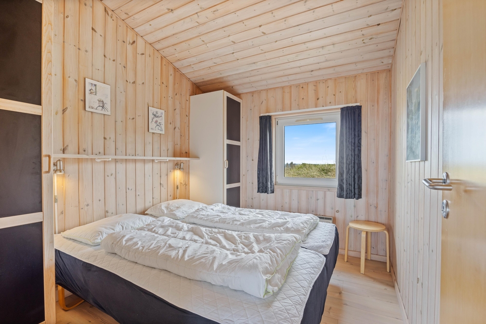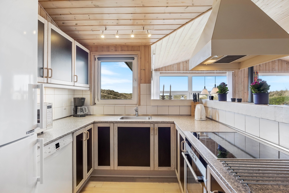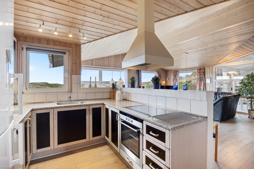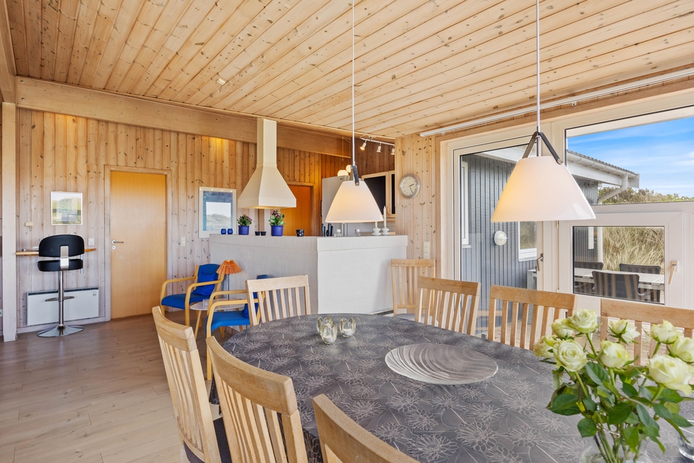 Når I træder ind i dette hyggelige feriehus, vil I med det samme mærke den hyggelige atmosfære, som trævæggene og -loftet skaber. I stuen kan I læne jer tilbage i sofaen og nyde den skønne udsigt udover klitlandskabet, mens brændeovnen giver jer en dejlig varme. Udover brændeovnen finder I også en varmepumpe i feriehuset, som er med til at sørge for, at I har en dejlig temperatur i feriehuset.