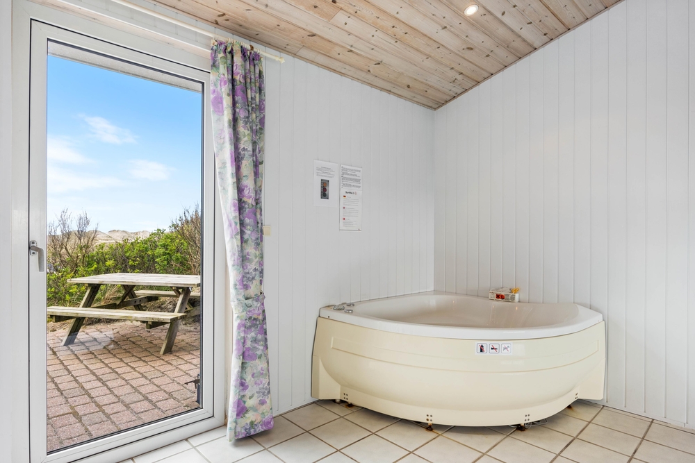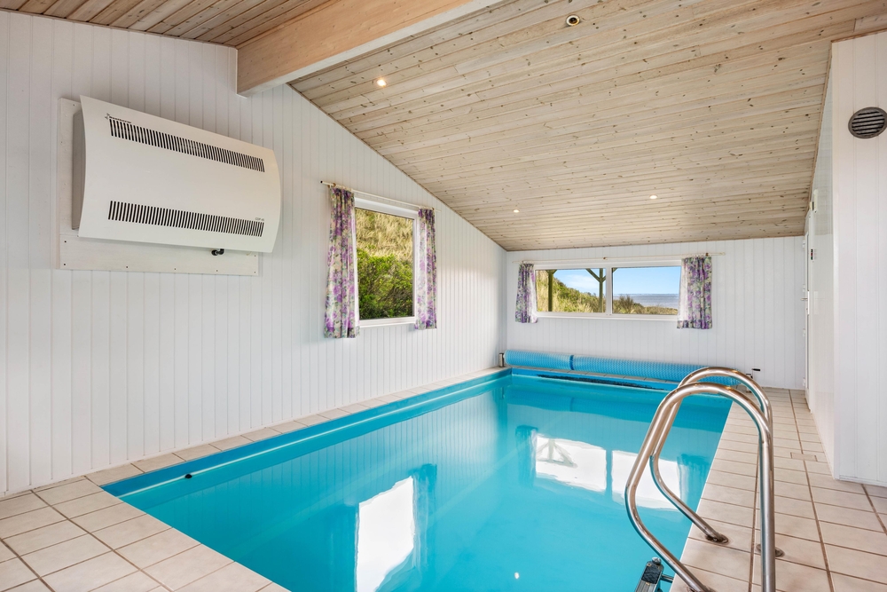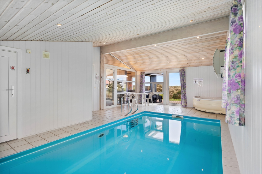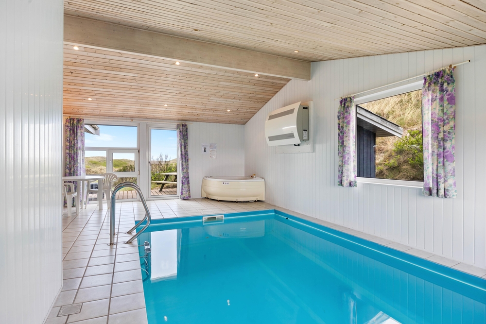 I den ene ende af feriehuset finder I et dejligt poolrum, hvor der er plads til at børnene kan bade i poolen. Her er der også et spabad, hvor I kan sidde og nyde varmen, imens i kigger udover de skønne klitlandskab. I finder også et par stole i poolrummet, som I kan sætte jer i, hvis I lige har brug for en pause fra vandet.