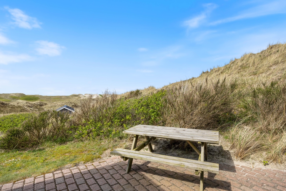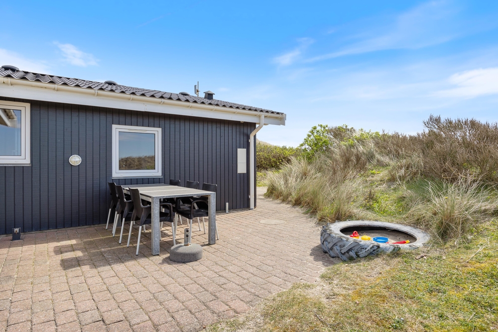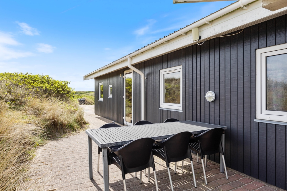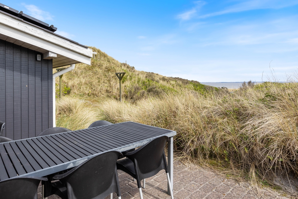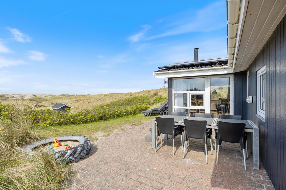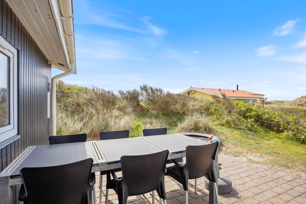 Rundt om feriehuset finder I en dejlig terrasse med en fantastisk udsigt. Her er der plads til, at I kan sætte jer ned og læse en god bog med udsigt ud over Ringkøbing Fjord. På den anden side af feriehuset er der også en beroligende og skøn udsigt udover klitlandskabet, som I kan nyde imens I sidder og spiser aftensmad, som I kan grille på feriehuset grill.