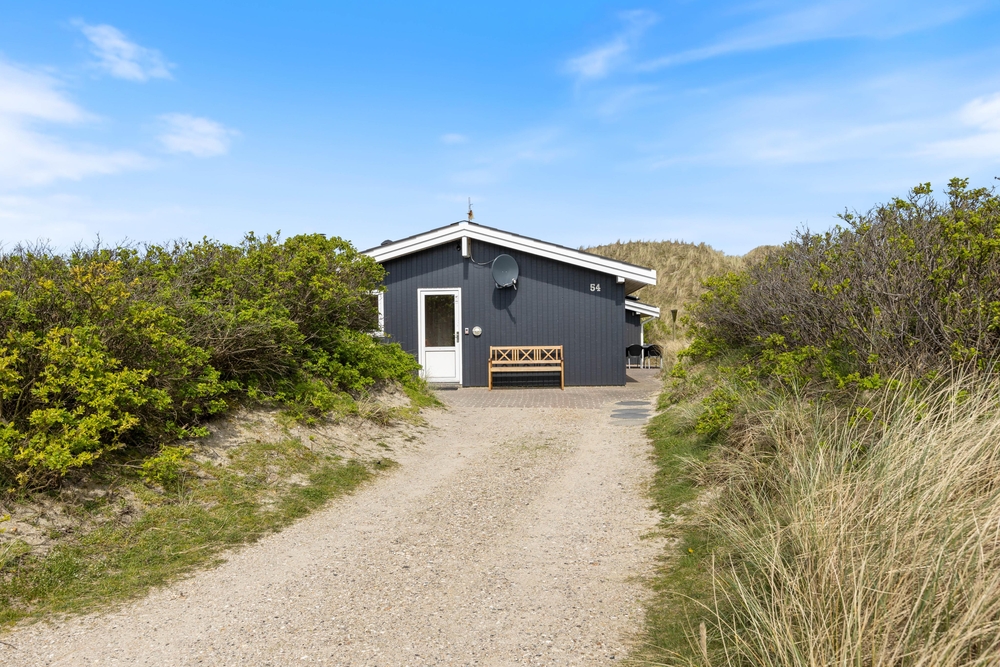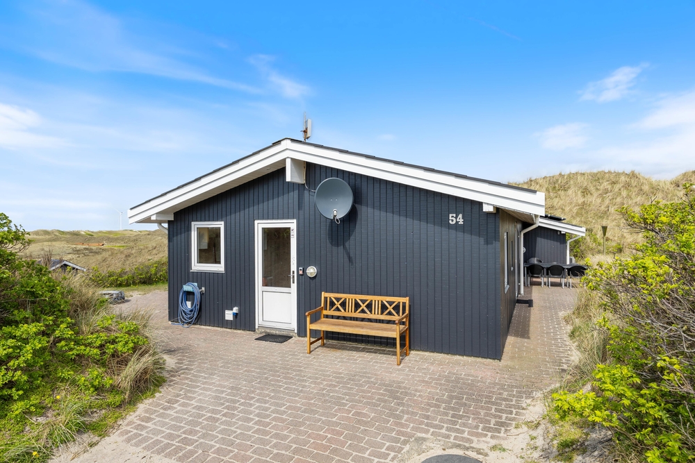 På Karen Brands Vej 54 finder I et hyggeligt feriehus med pool og spa. I poolrummet er der plads til at børnene kan bade i poolen, mens de voksne kan sidde og slappe af i spaen. I stuen har I en skøn udsigt ud over klitterne, som I kan nyde, mens I kan mærke den dejlige varme fra brændeovnen. Når vejret byder op til det, kan I sætte jer ud på terrassen, hvor I har en fantastisk udsigt ud over Ringkøbing Fjord ? på den anden side af feriehuset har I en skøn udsigt ud over klitterne.
