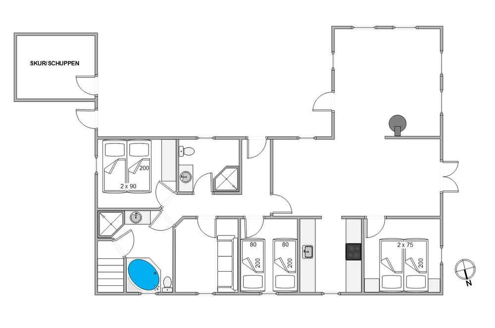 Med plads til 8 personer er huset indrettet med 2 badeværelser, og I behøver altså aldrig at stå i kø til toilettet. På det største badeværelse finder I desuden både en sauna og en spa, så I rigtig kan forkæle jer selv og hinanden.