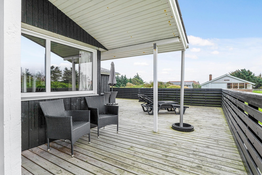 Sommerhuset har en stor lukket terrasse, som er indrettet med havemøbler, liggestole samt en grill, så I kan afslutte en god feriedag med en lækker bøf og et køligt glas vin. På den store naturgrund er der god tumleplads til børnene. Ikke langt fra sommerhuset ligger den lokale købmand og ligeledes en god legeplads.