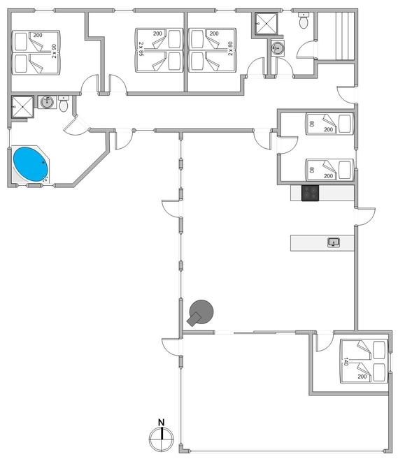 Sommerhuset har hele 5 lyse soveværelser, hvor de 4 er med dobbeltsenge og 1 er med 2 enkeltsenge. Der findes 2 gode badeværelser med gulvvarme. Det ene badeværelse er med spa og det andet er med sauna. Så her er alle muligheder for afslapning og afstresning efter en kølig dag i klitterne.
