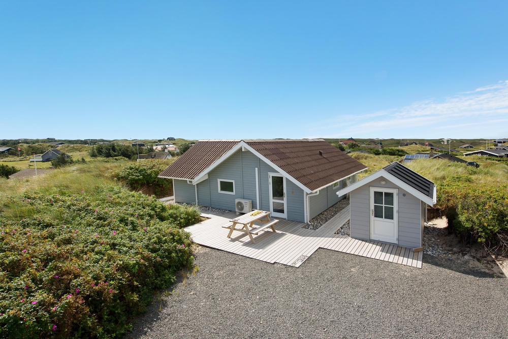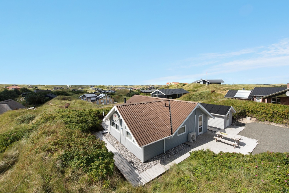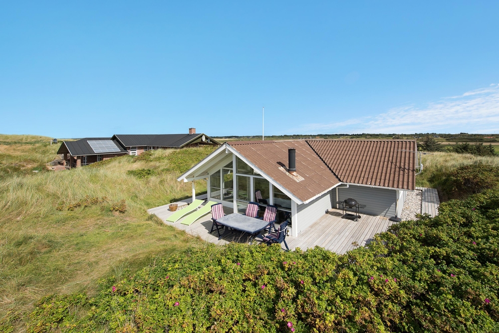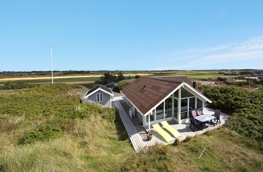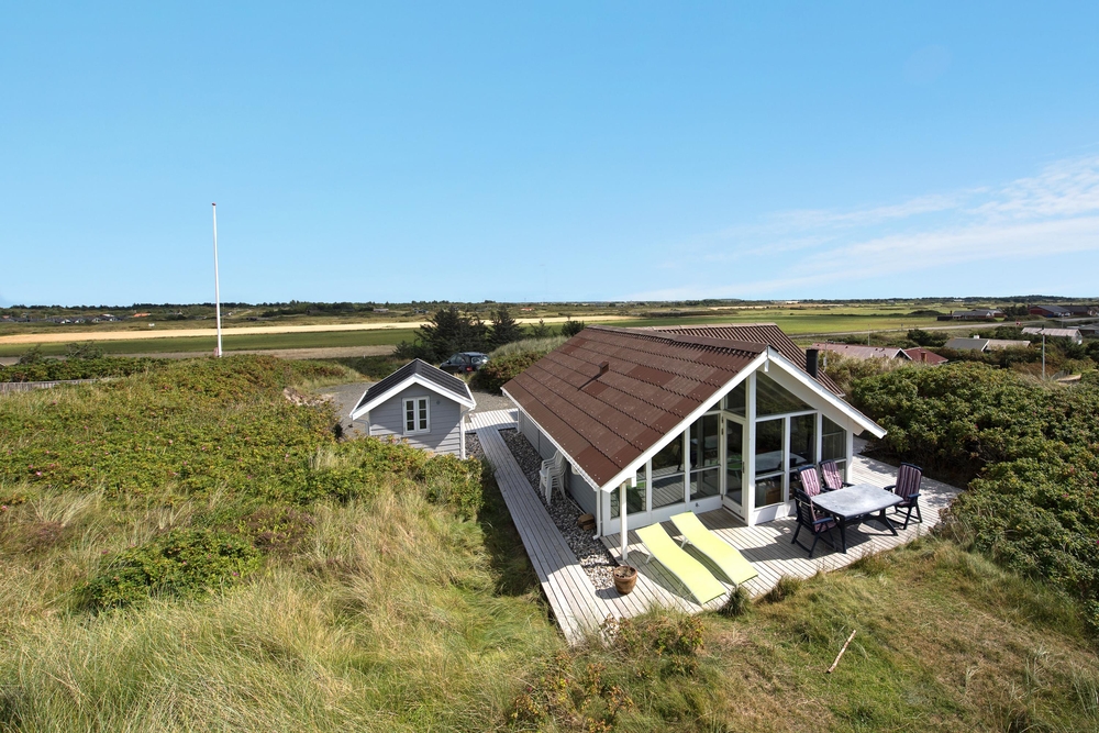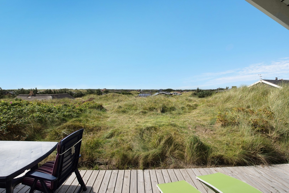 Ude for huset finder I en lækker terrasse. Den lækre træterrasse går hele vejen rundt om huset, og mod vest finder I terrassemøblementet. Her kan på dejlige sommerdage sætte jer til rette, og bare nyde jeres ferie. Fra terrassen har i en dejlig udsigt over nærområdet, og de fleste dage vil I kunne høre lyden af Vesterhavets brusen.